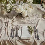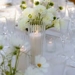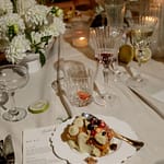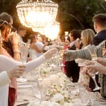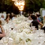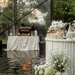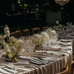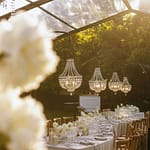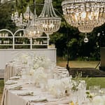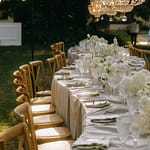 Dinner was set along one long, elegant table with chandeliers hanging softly overhead. Layers of flowing fabric, thoughtful details and stunning table décor created a romantic and refined look, with Italian music playing in the background.