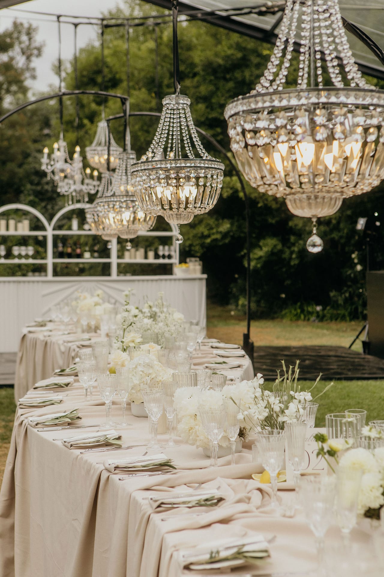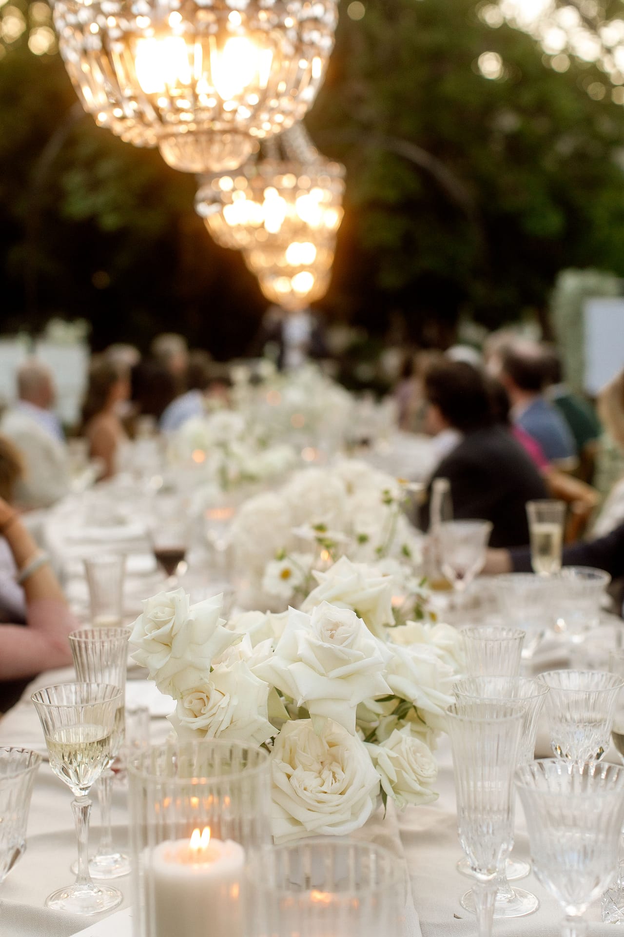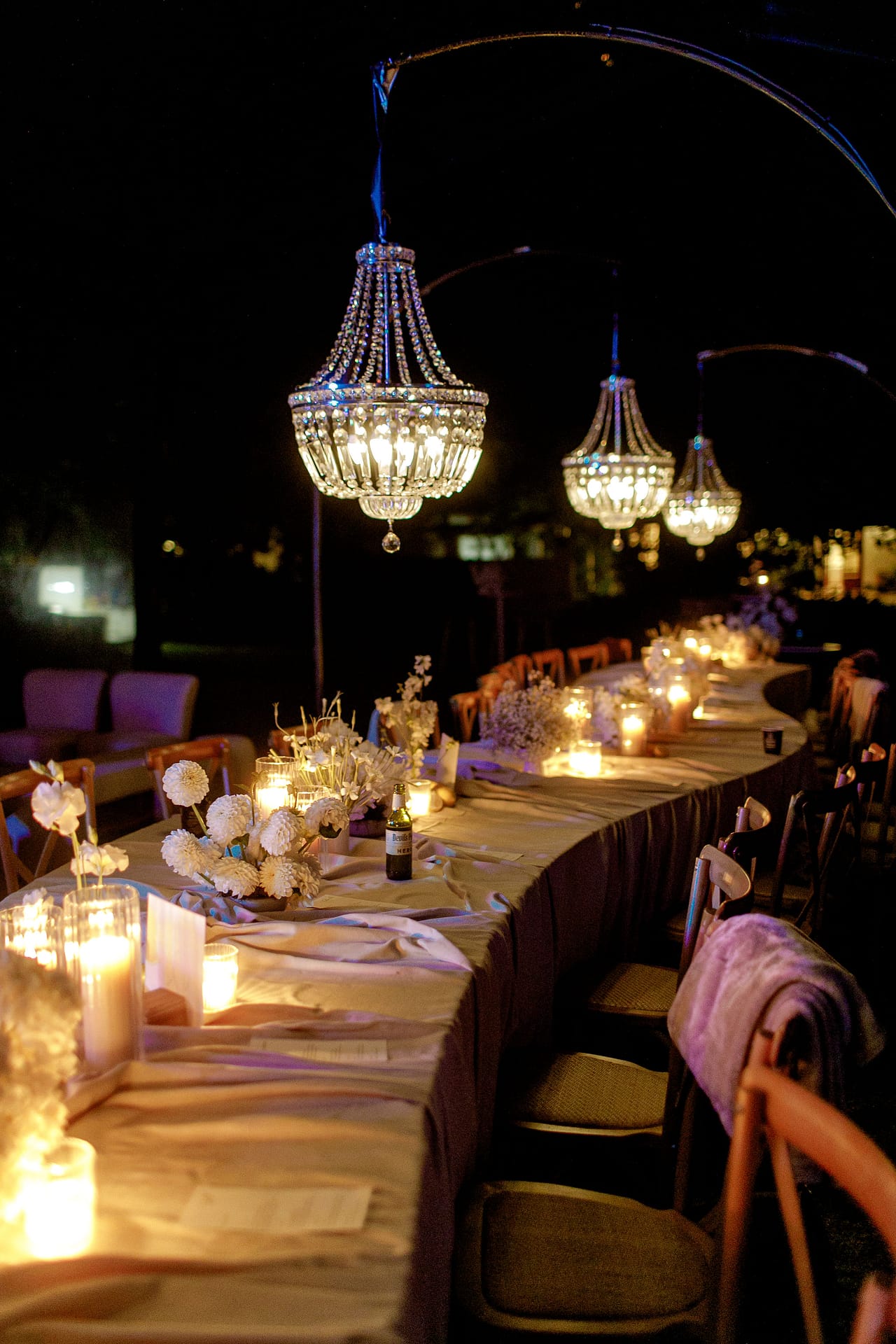 Dinner was set along one long, elegant table with chandeliers hanging softly overhead. Layers of flowing fabric, thoughtful details and stunning table décor created a romantic and refined look, with Italian music playing in the background.