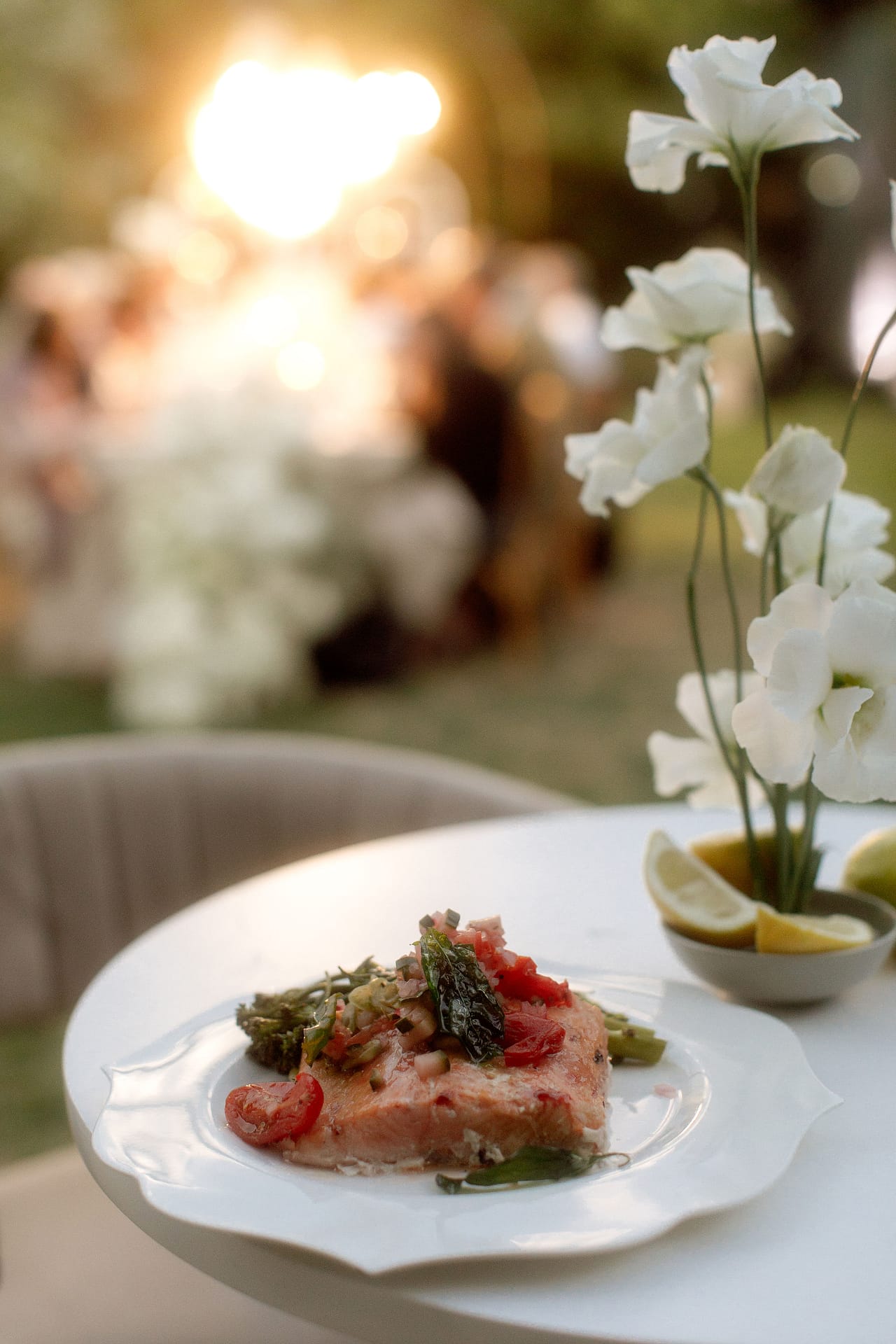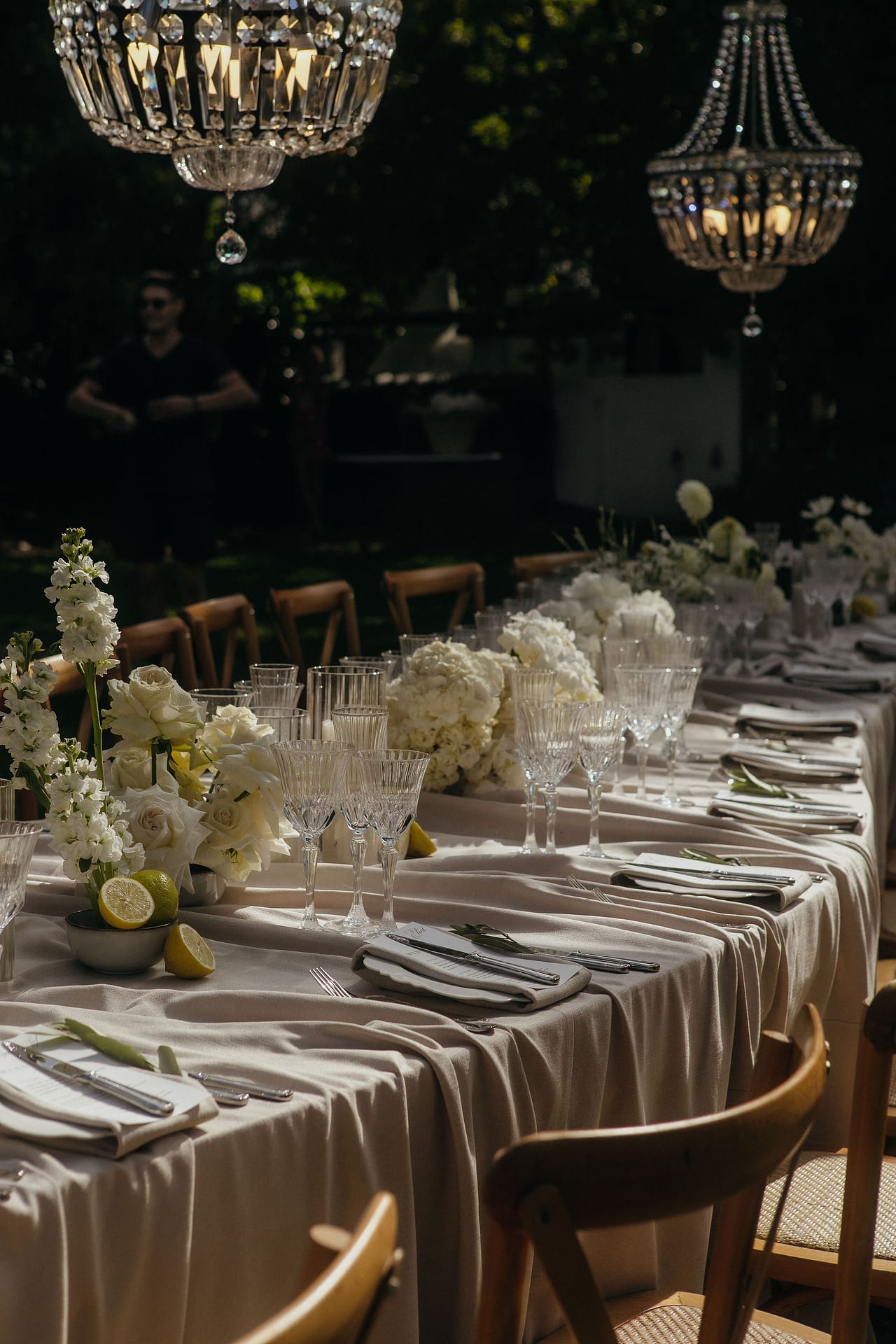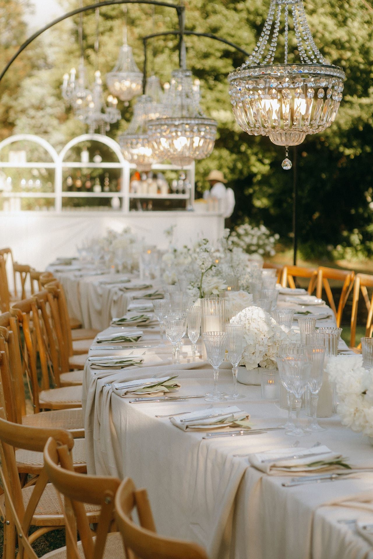 Dinner was set along one long, elegant table with chandeliers hanging softly overhead. Layers of flowing fabric, thoughtful details and stunning table décor created a romantic and refined look, with Italian music playing in the background.