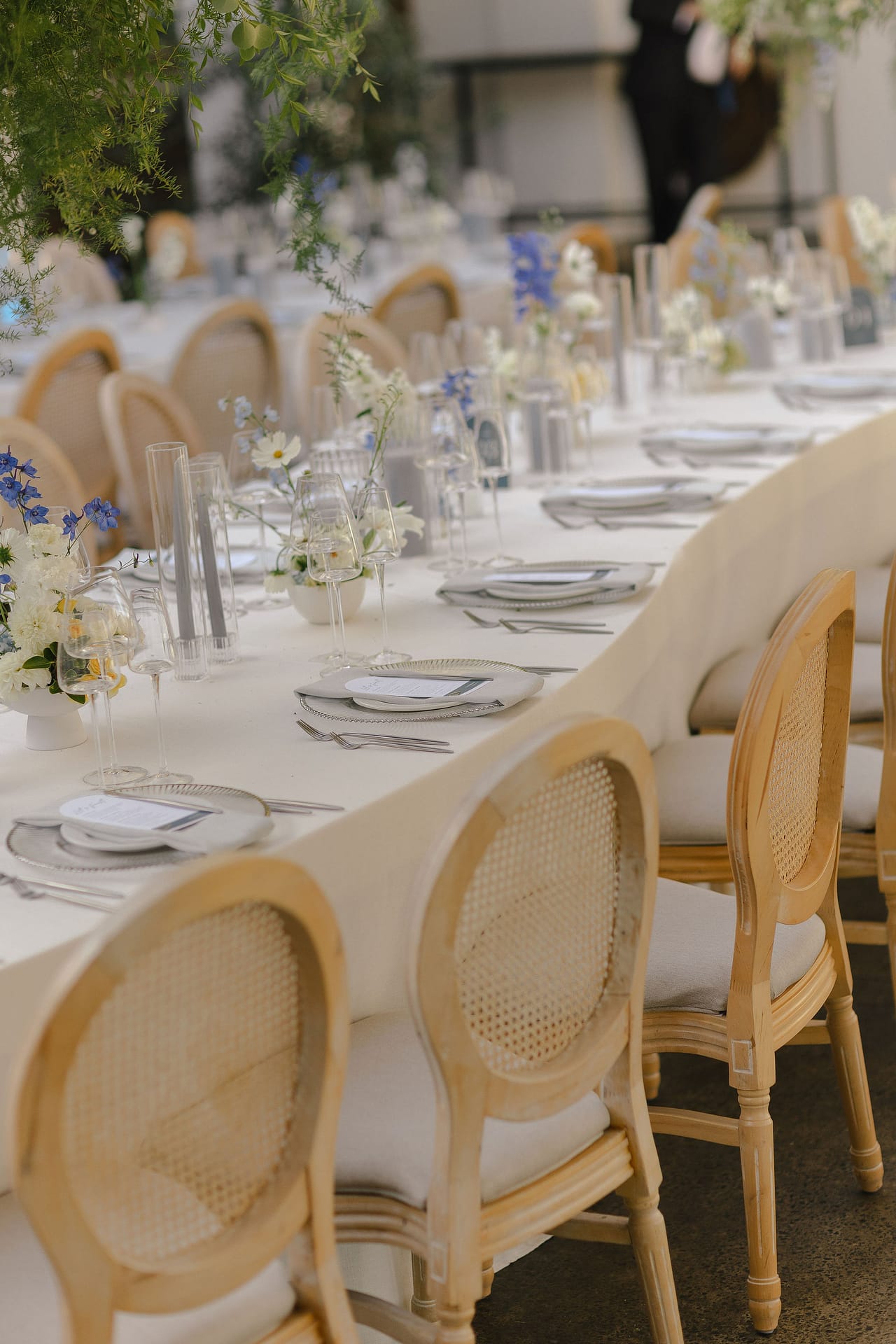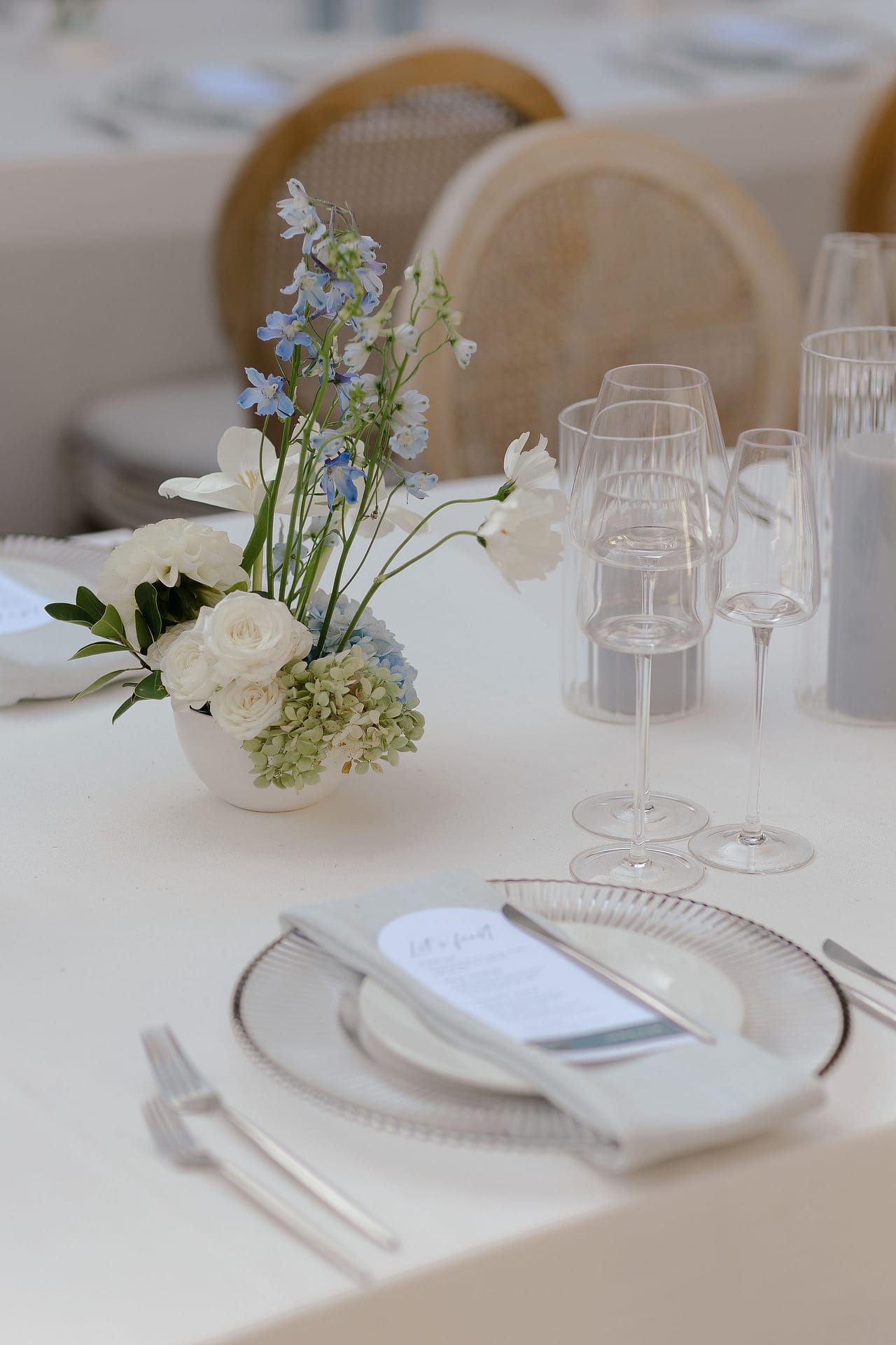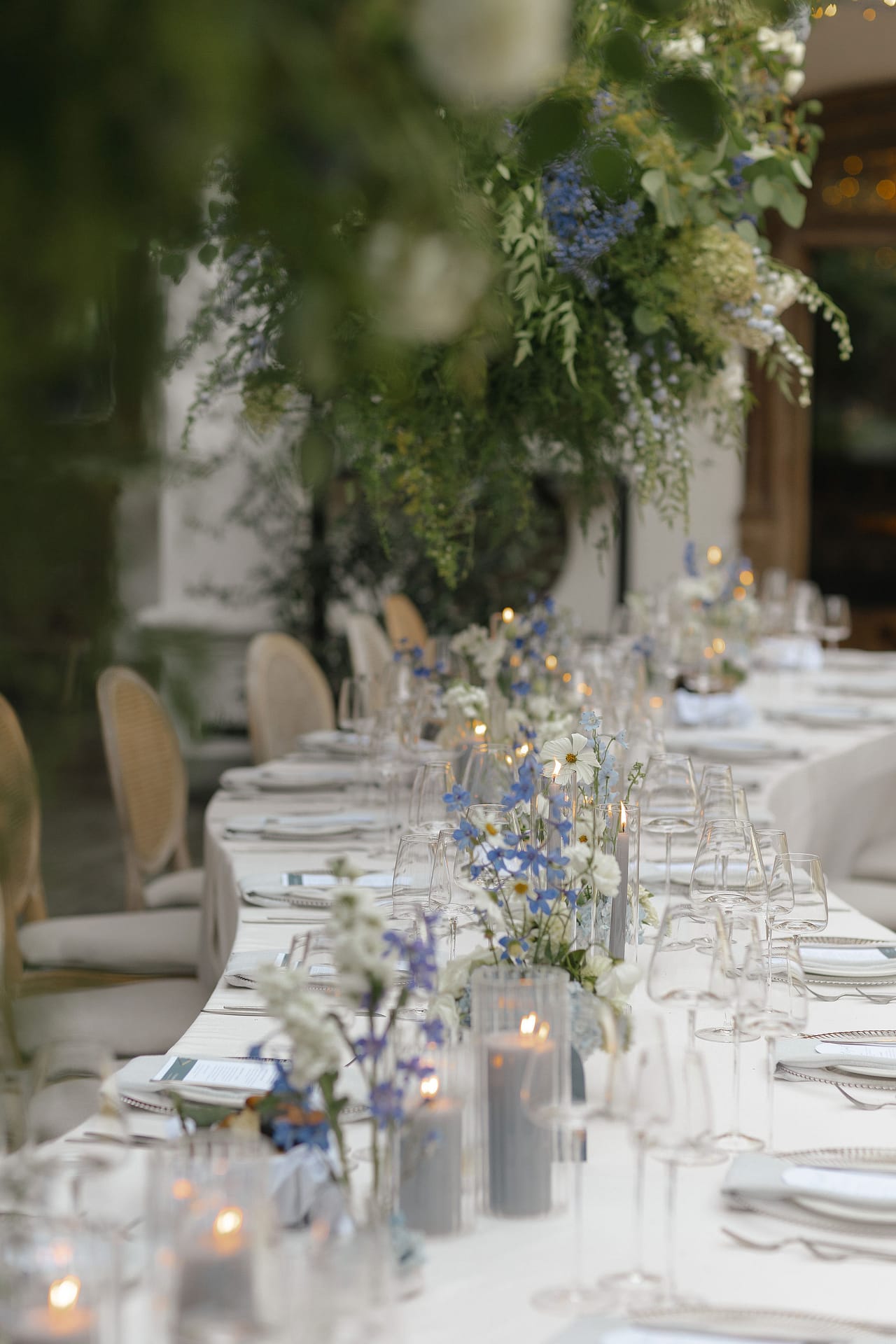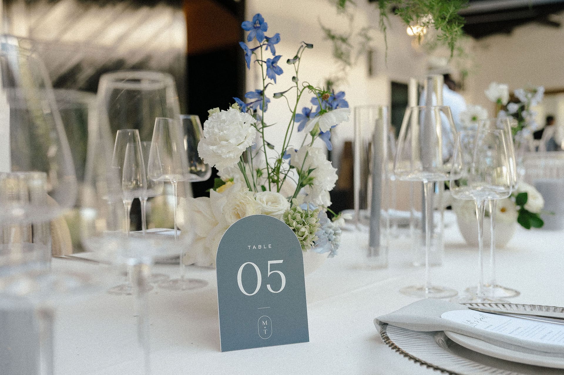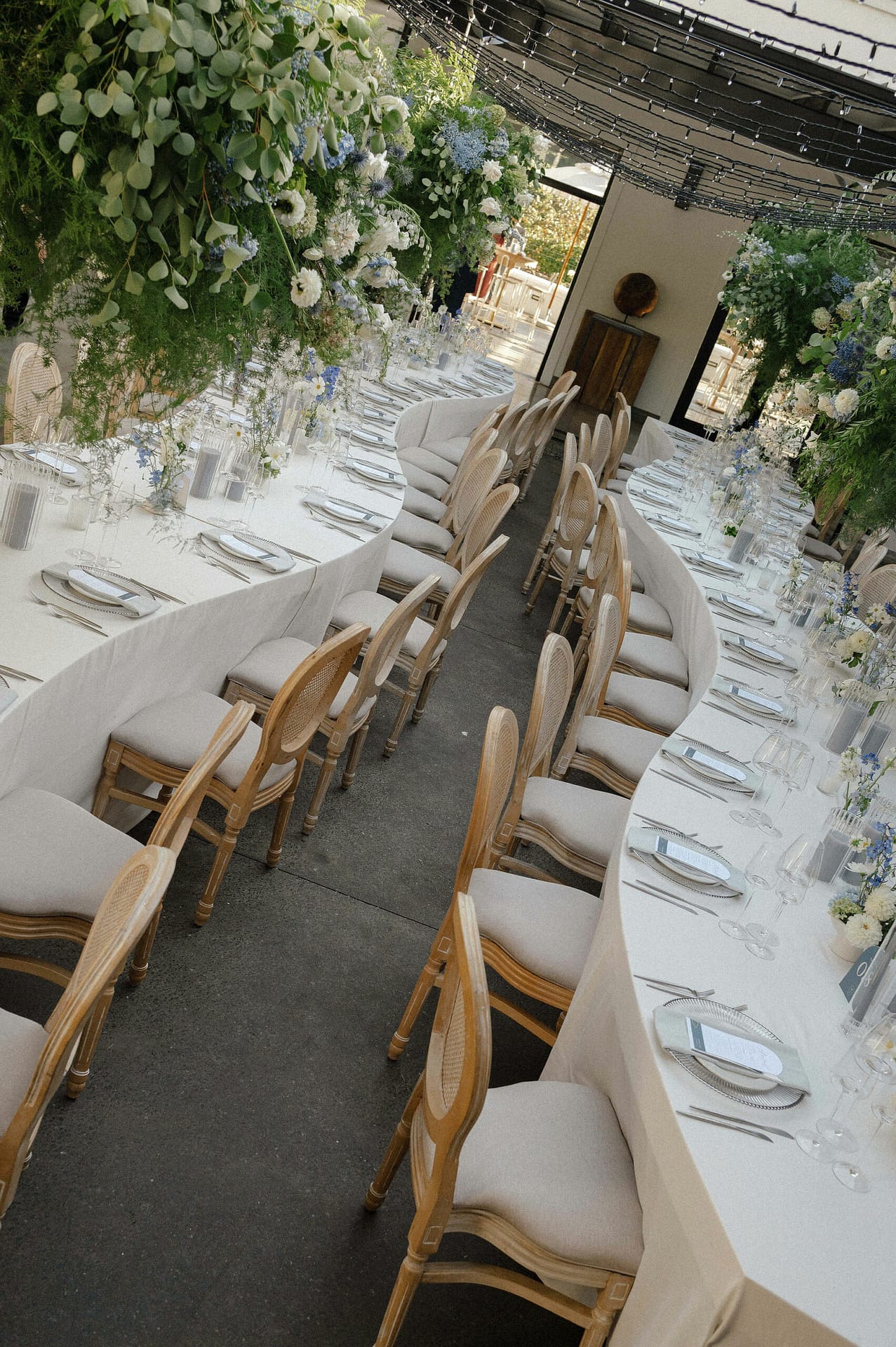 The wedding day itself carried a completely different tone, while still feeling true to them. The design centred around a blue and white palette, clean, classic, and striking without trying too hard. Curved tables softened the space and created a more fluid layout, encouraging conversation and movement throughout the evening.