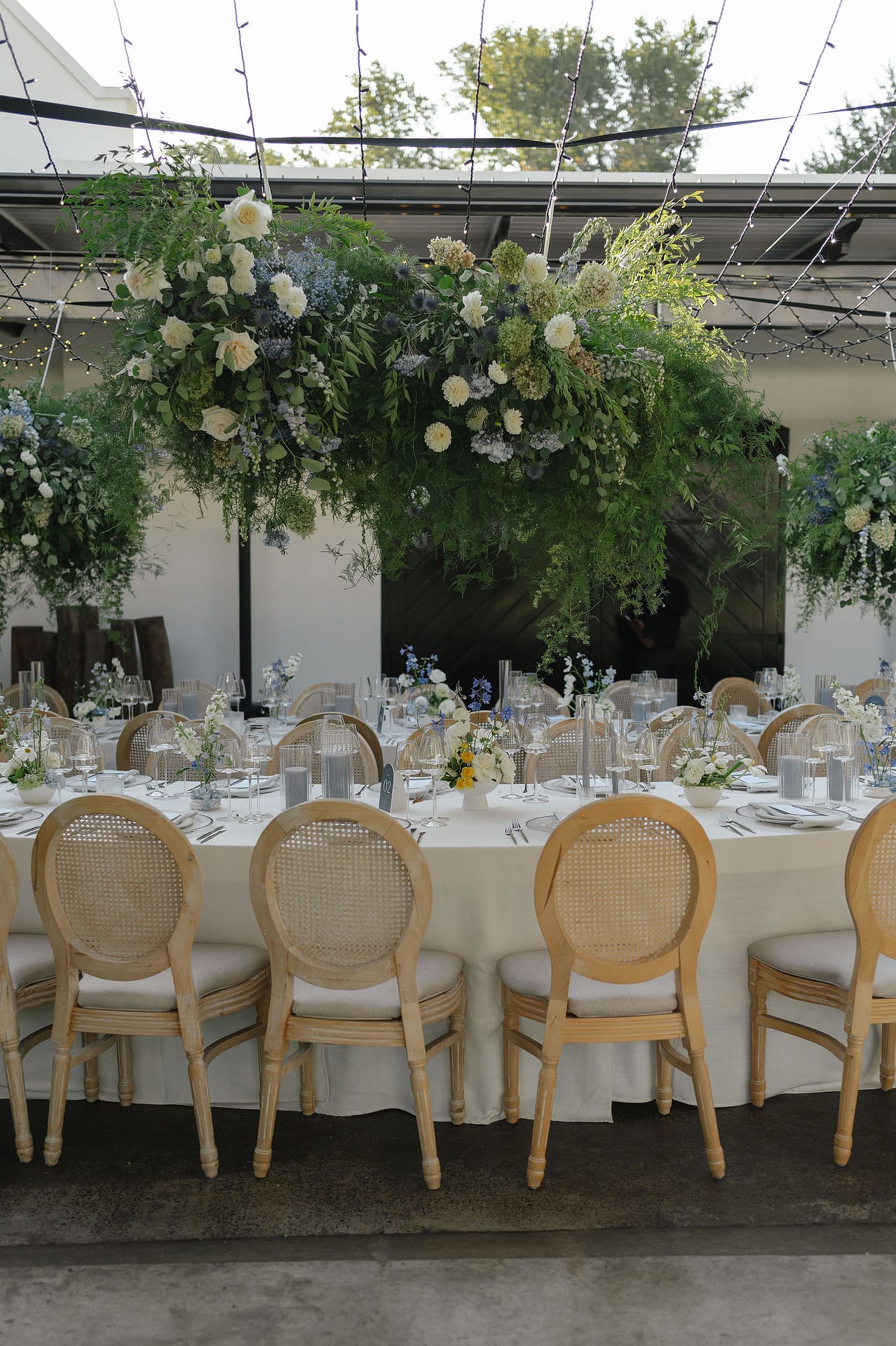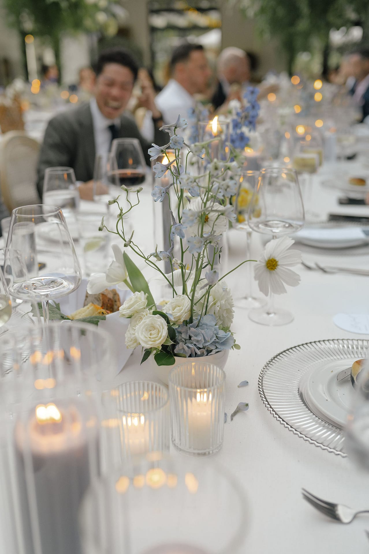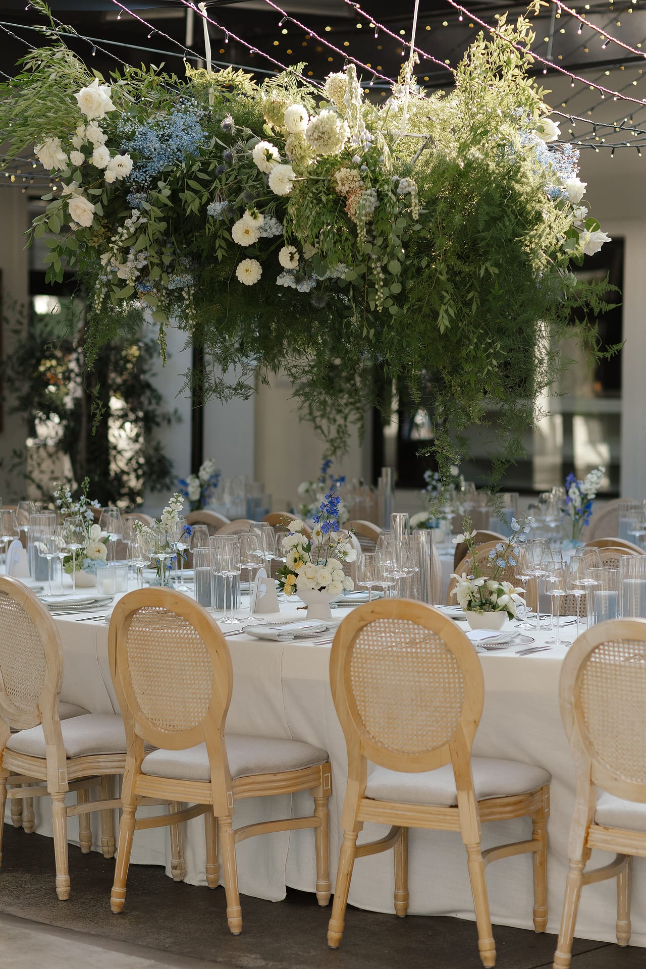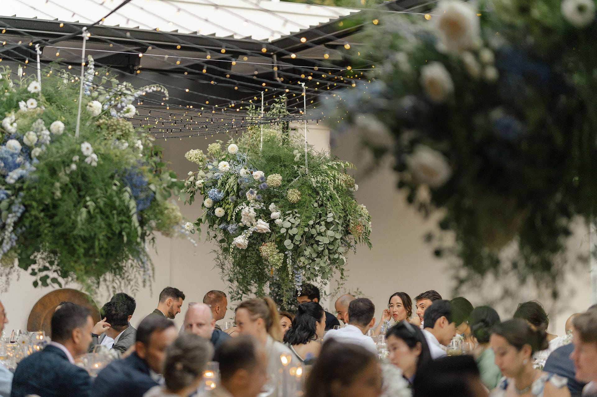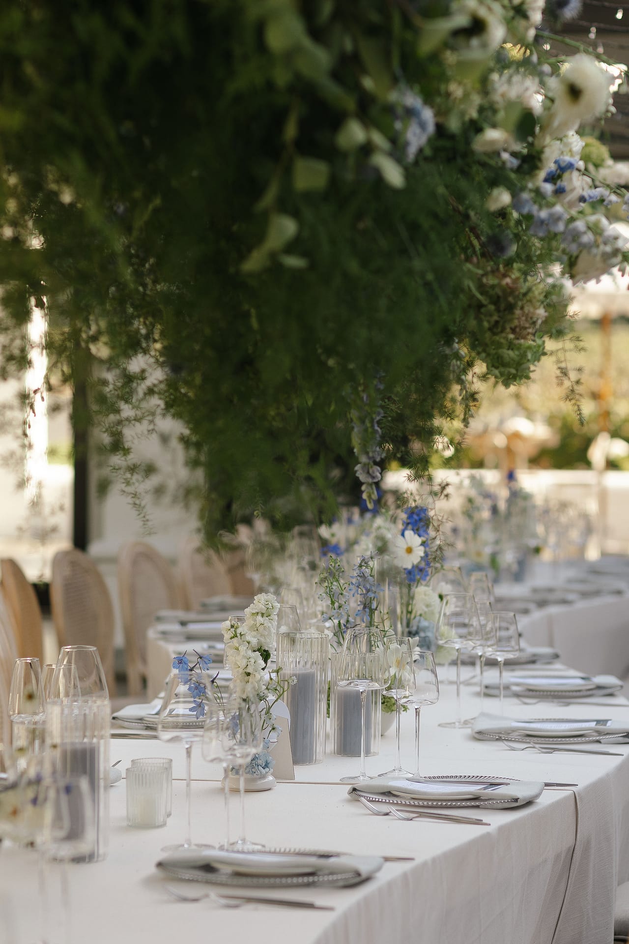 The wedding day itself carried a completely different tone, while still feeling true to them. The design centred around a blue and white palette, clean, classic, and striking without trying too hard. Curved tables softened the space and created a more fluid layout, encouraging conversation and movement throughout the evening.