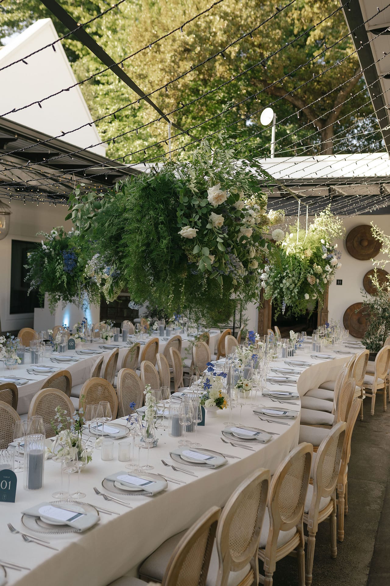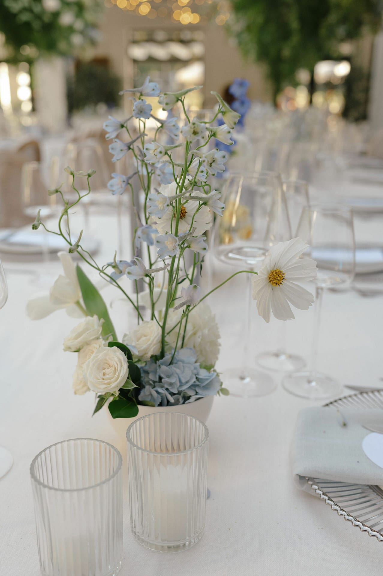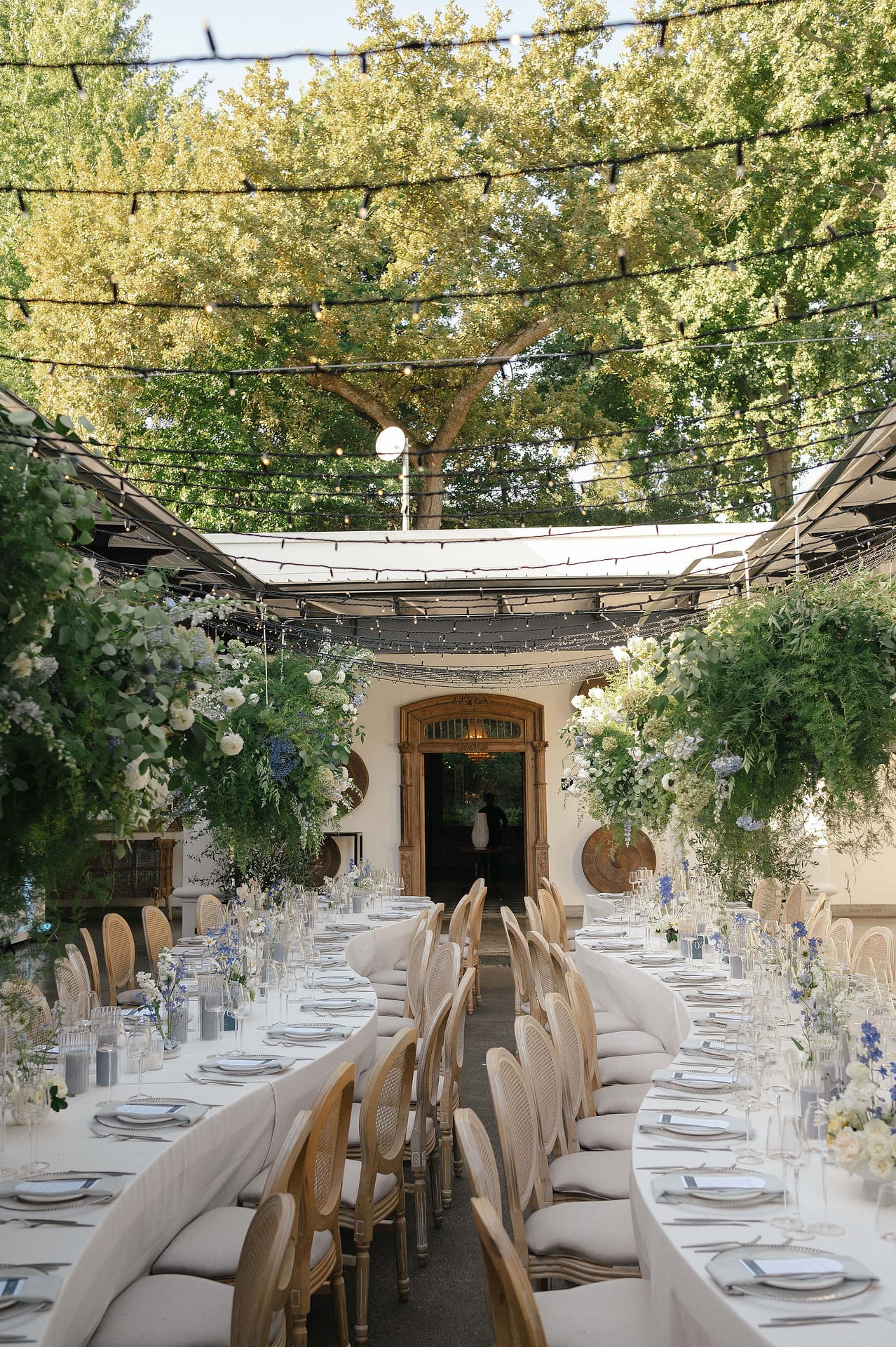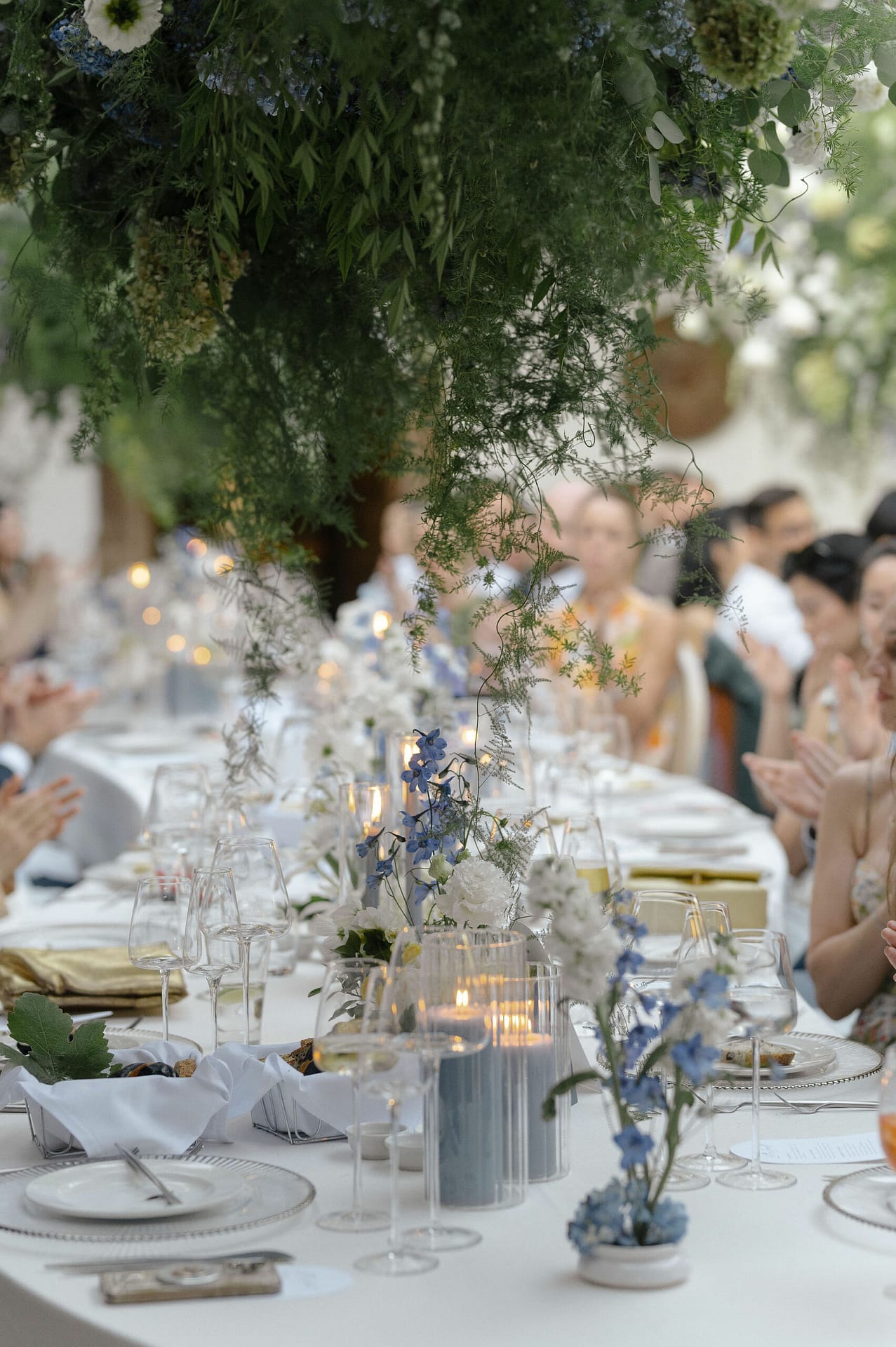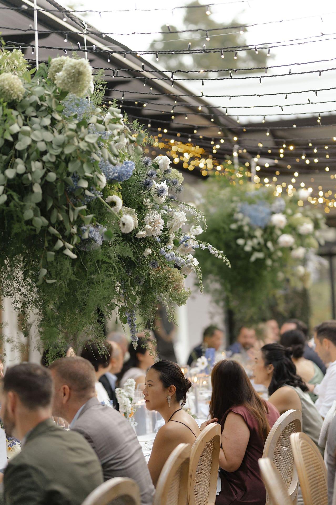 The wedding day itself carried a completely different tone, while still feeling true to them. The design centred around a blue and white palette, clean, classic, and striking without trying too hard. Curved tables softened the space and created a more fluid layout, encouraging conversation and movement throughout the evening.