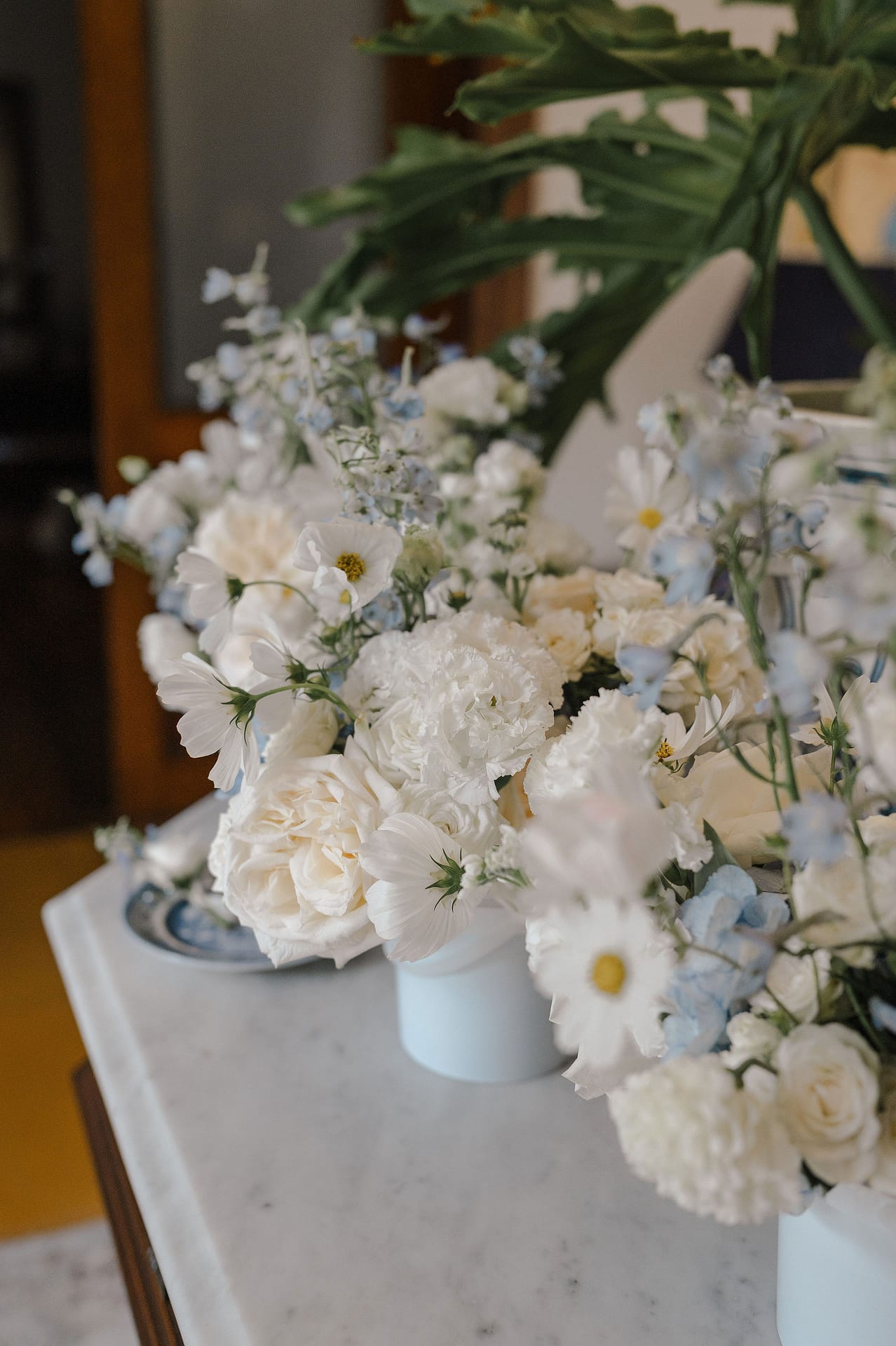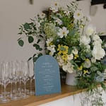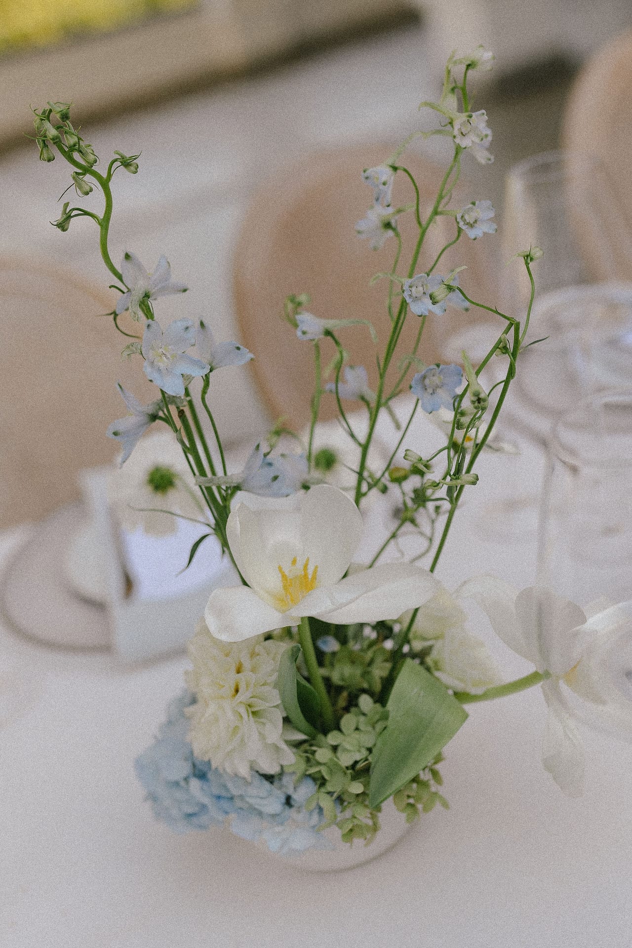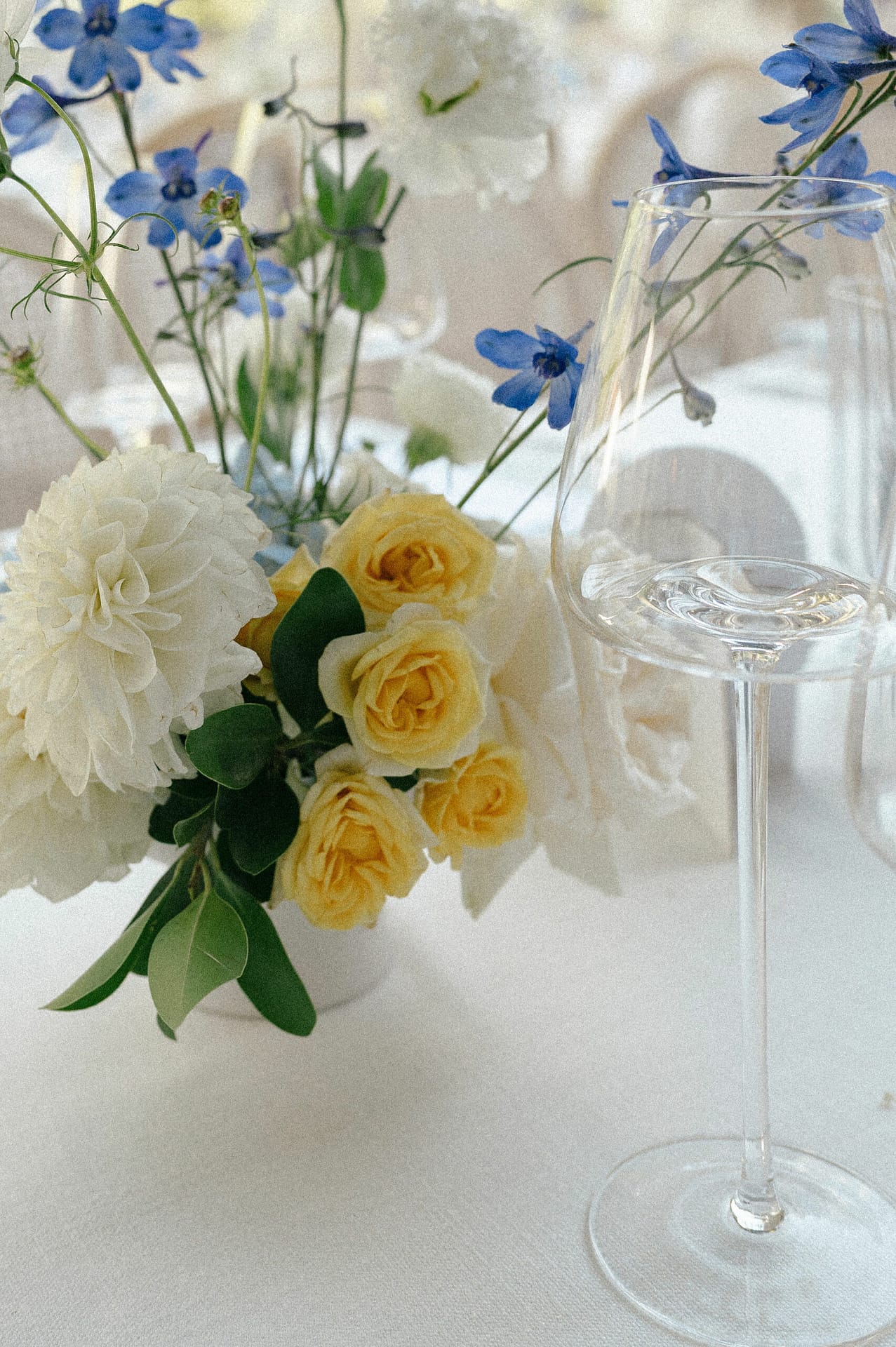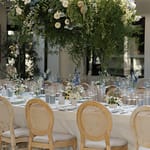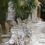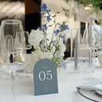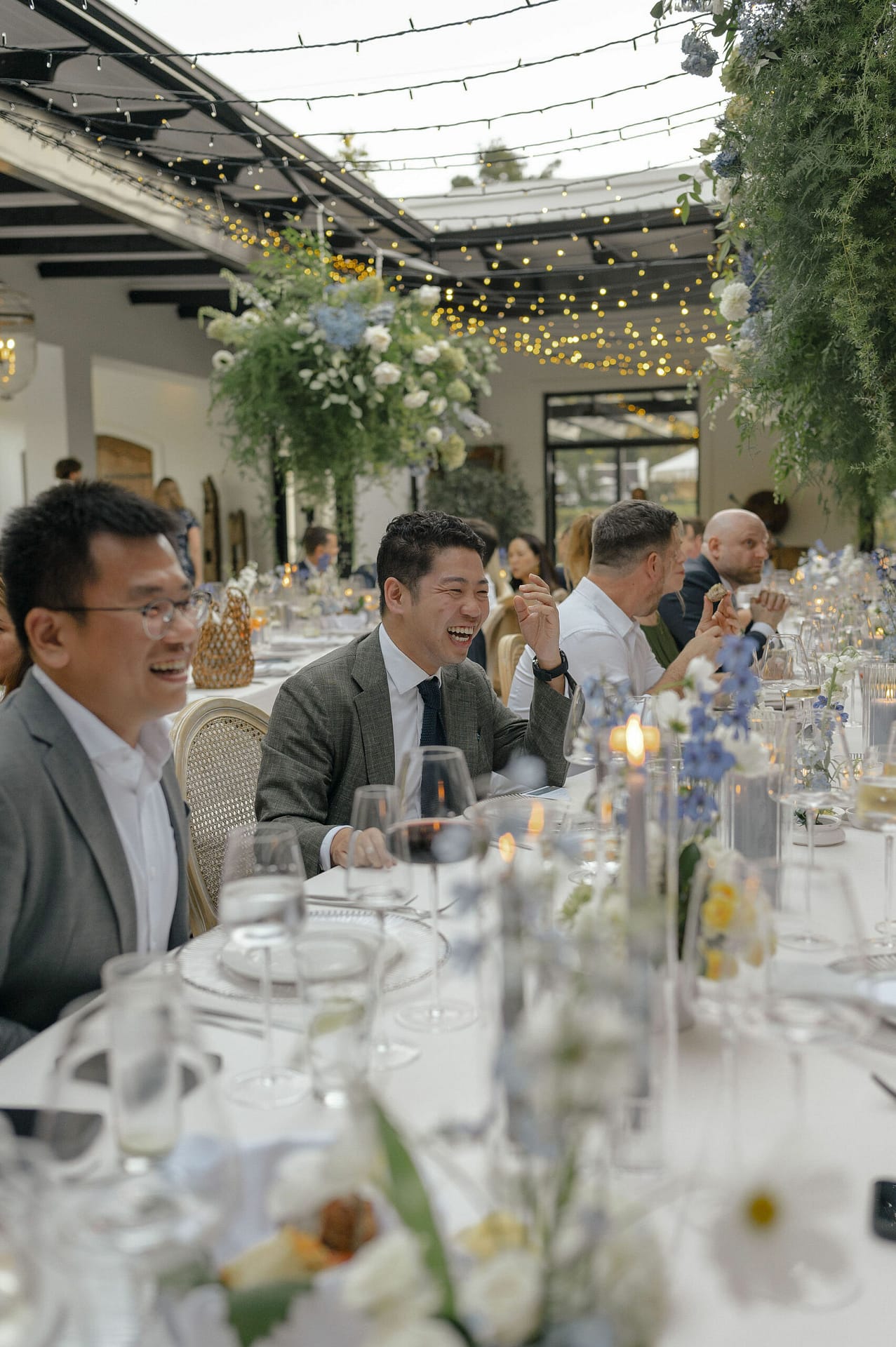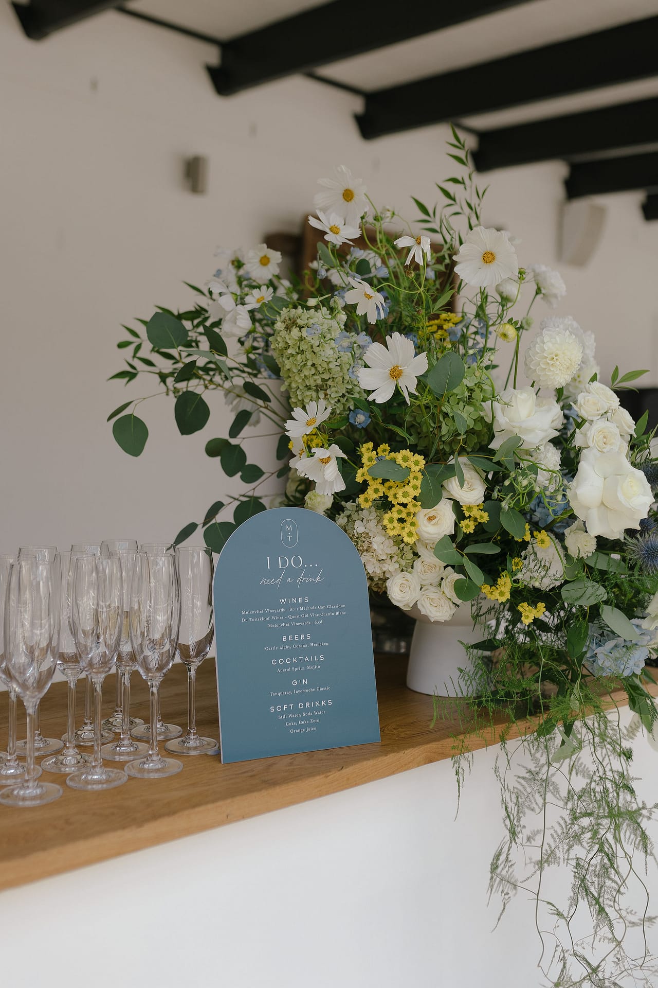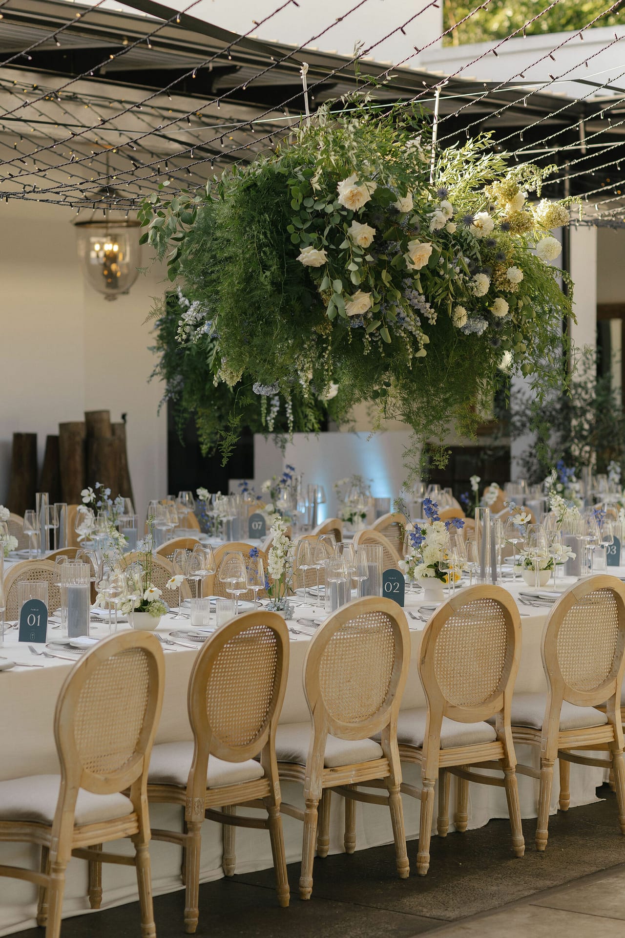 The wedding day itself carried a completely different tone, while still feeling true to them. The design centred around a blue and white palette, clean, classic, and striking without trying too hard. Curved tables softened the space and created a more fluid layout, encouraging conversation and movement throughout the evening.