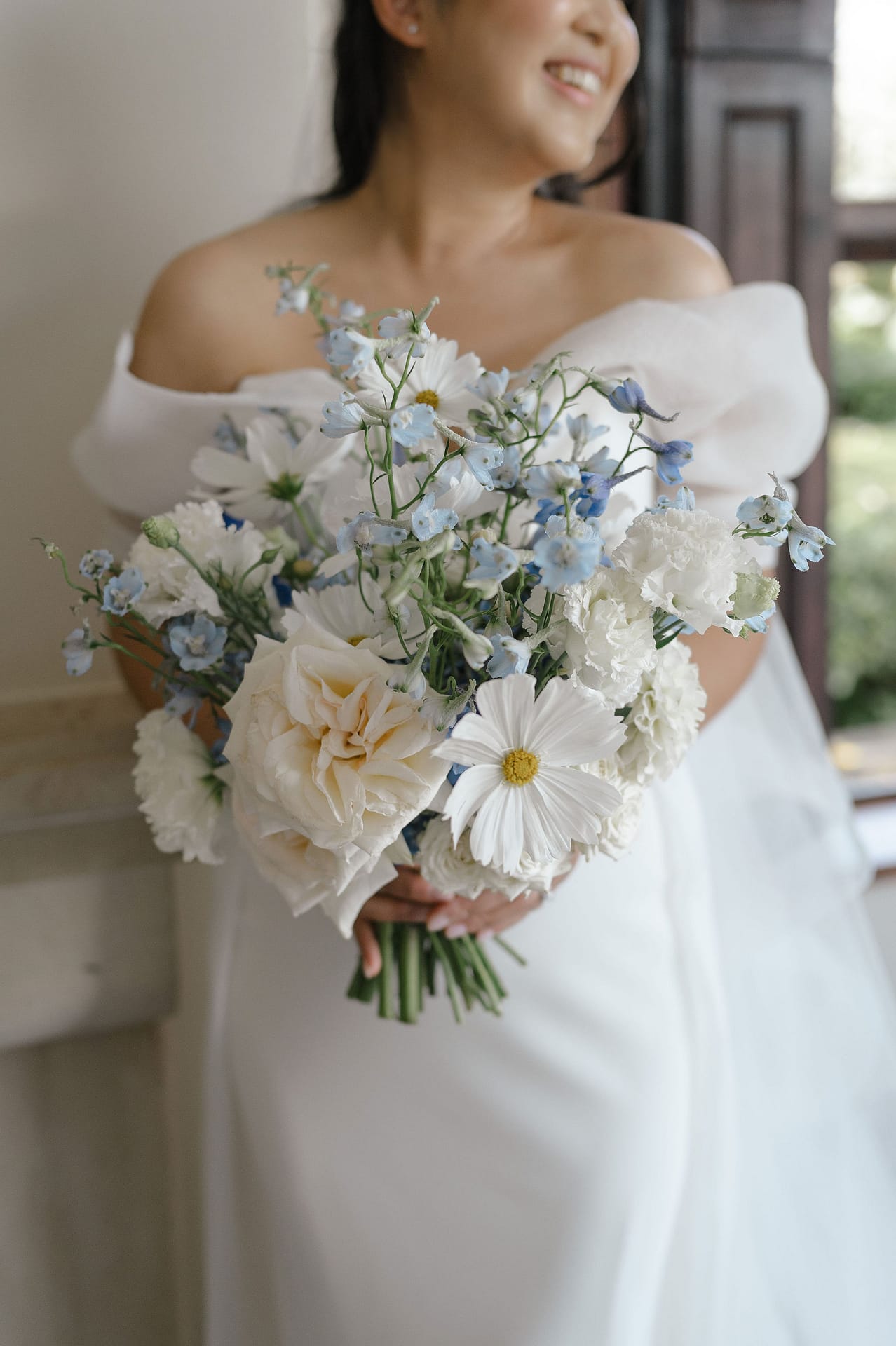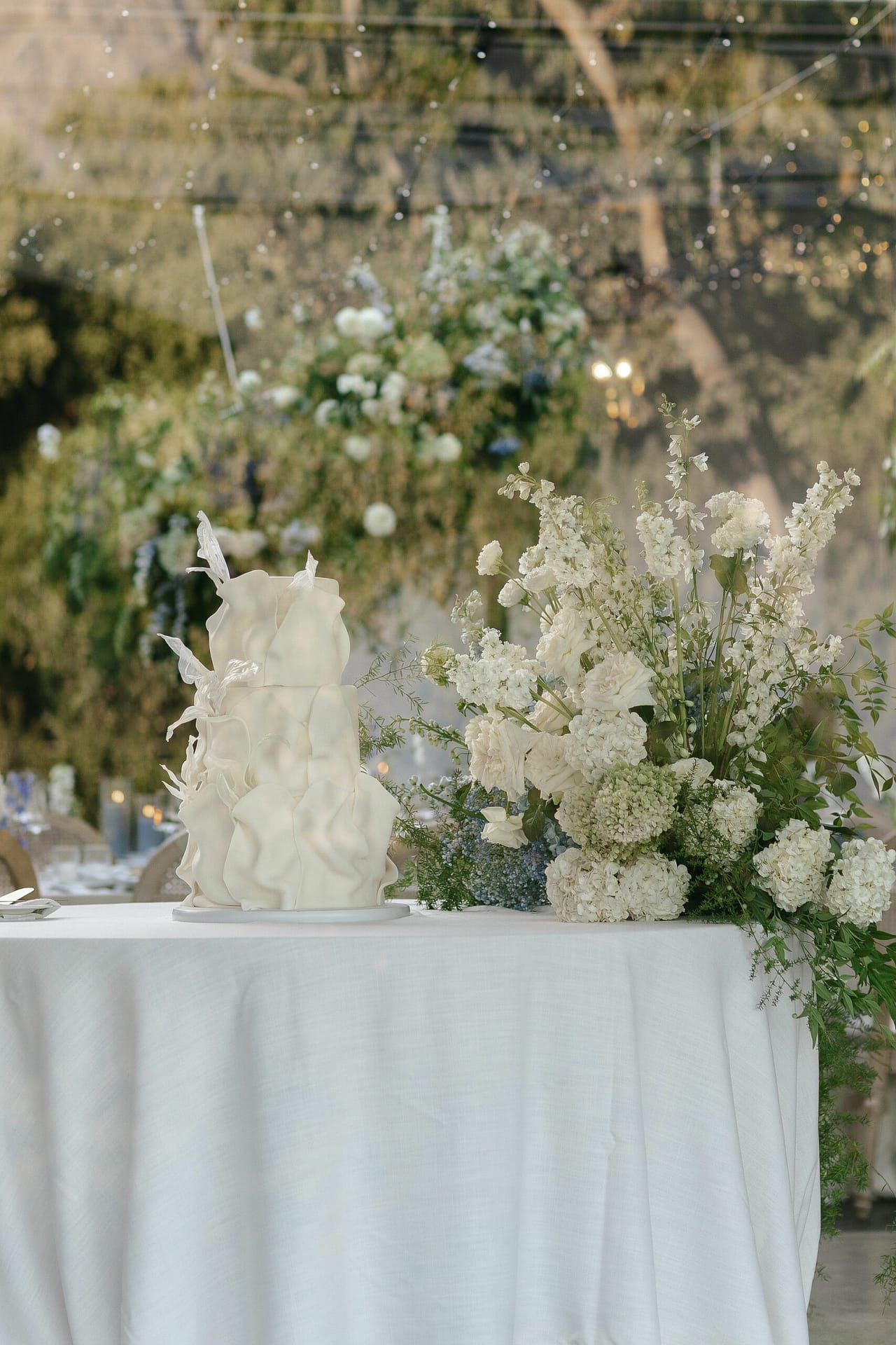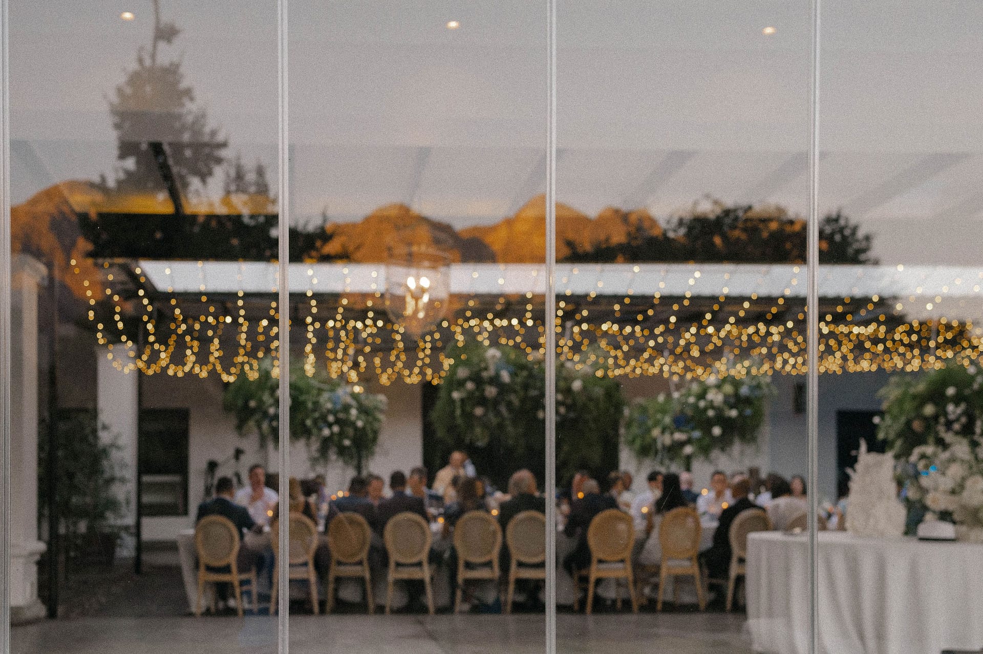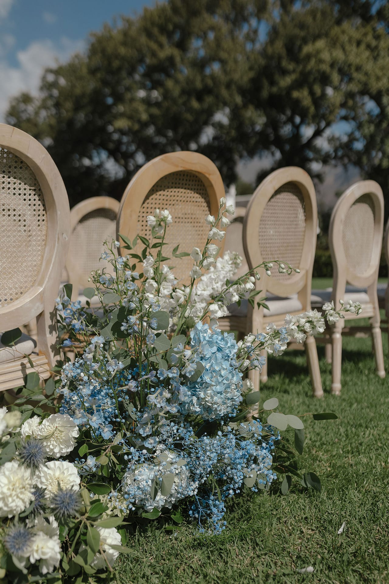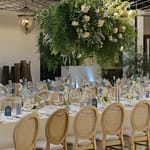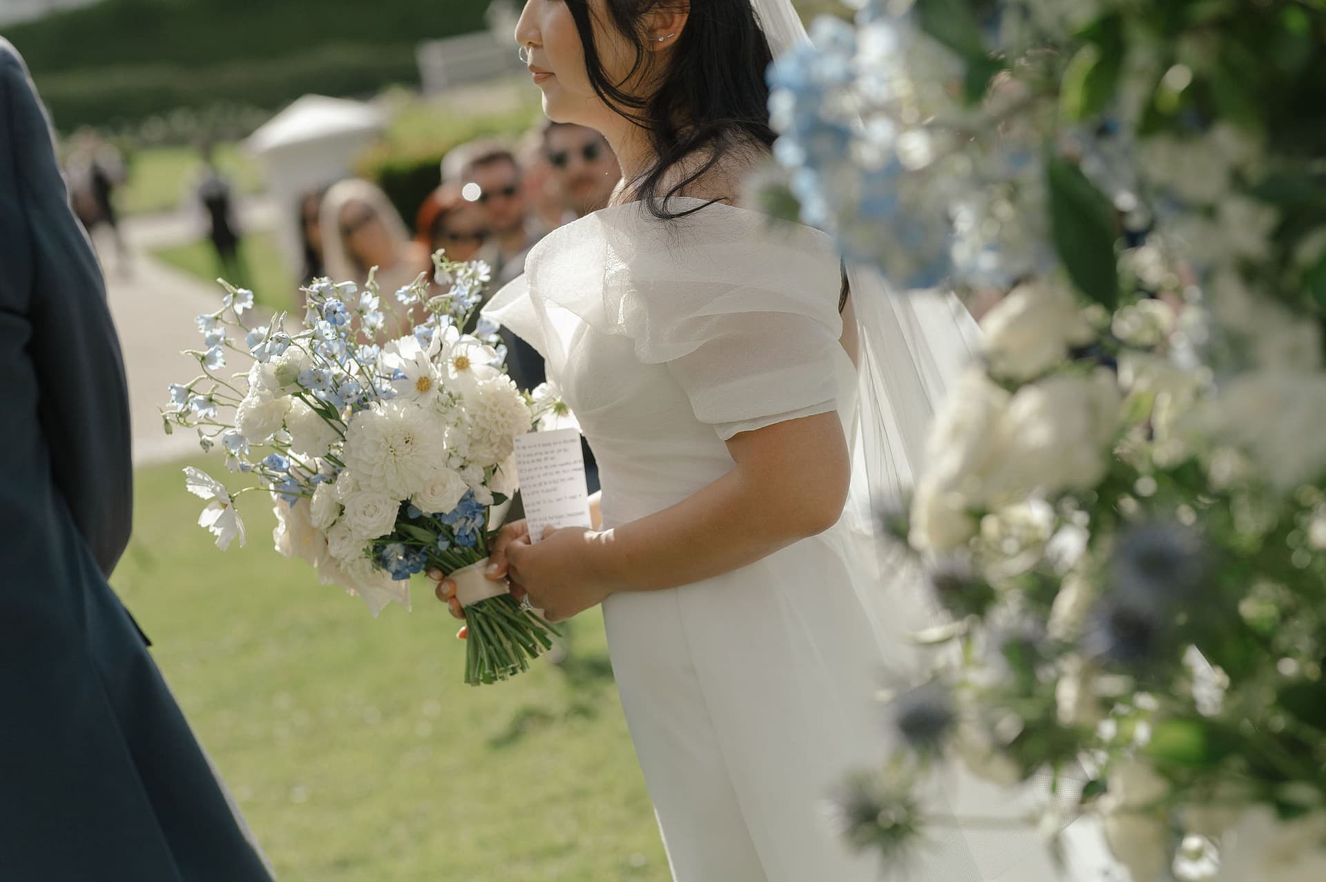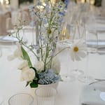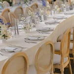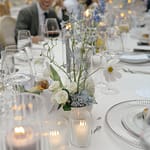 The wedding day itself carried a completely different tone, while still feeling true to them. The design centred around a blue and white palette, clean, classic, and striking without trying too hard. Curved tables softened the space and created a more fluid layout, encouraging conversation and movement throughout the evening.