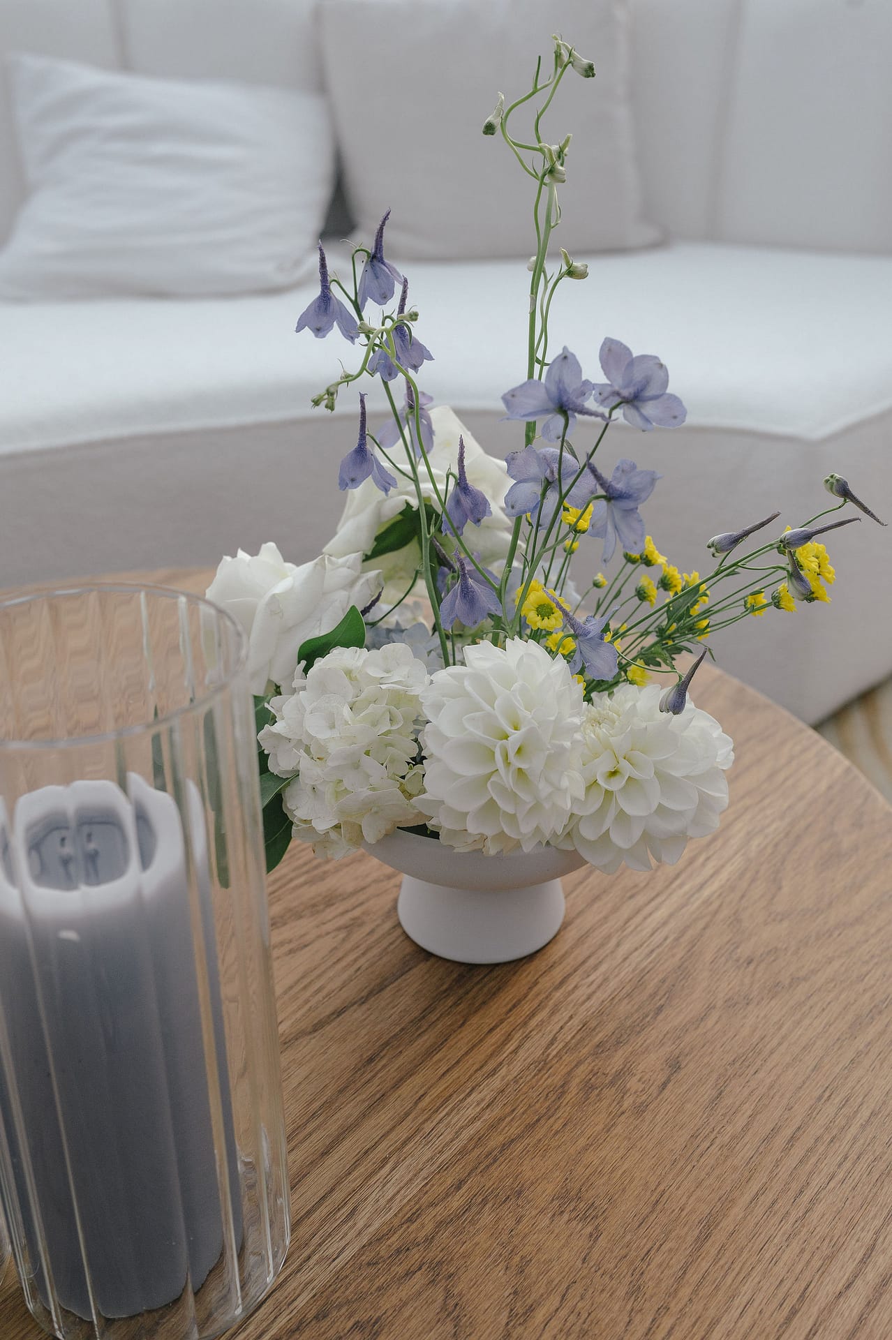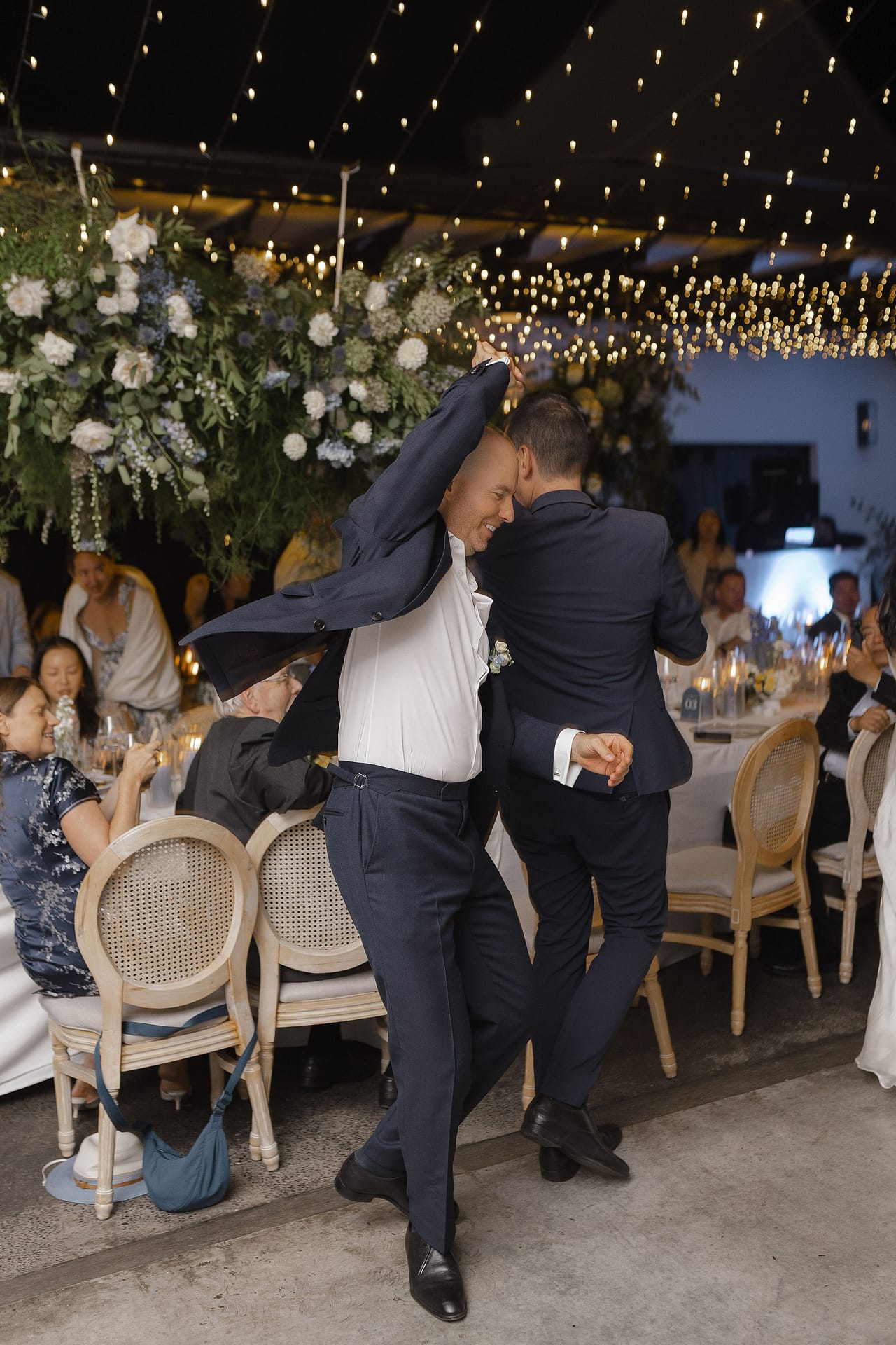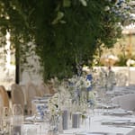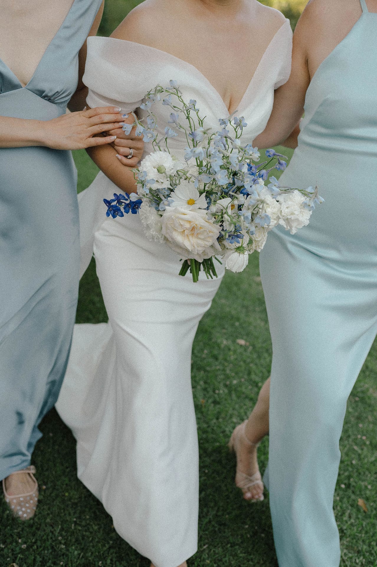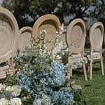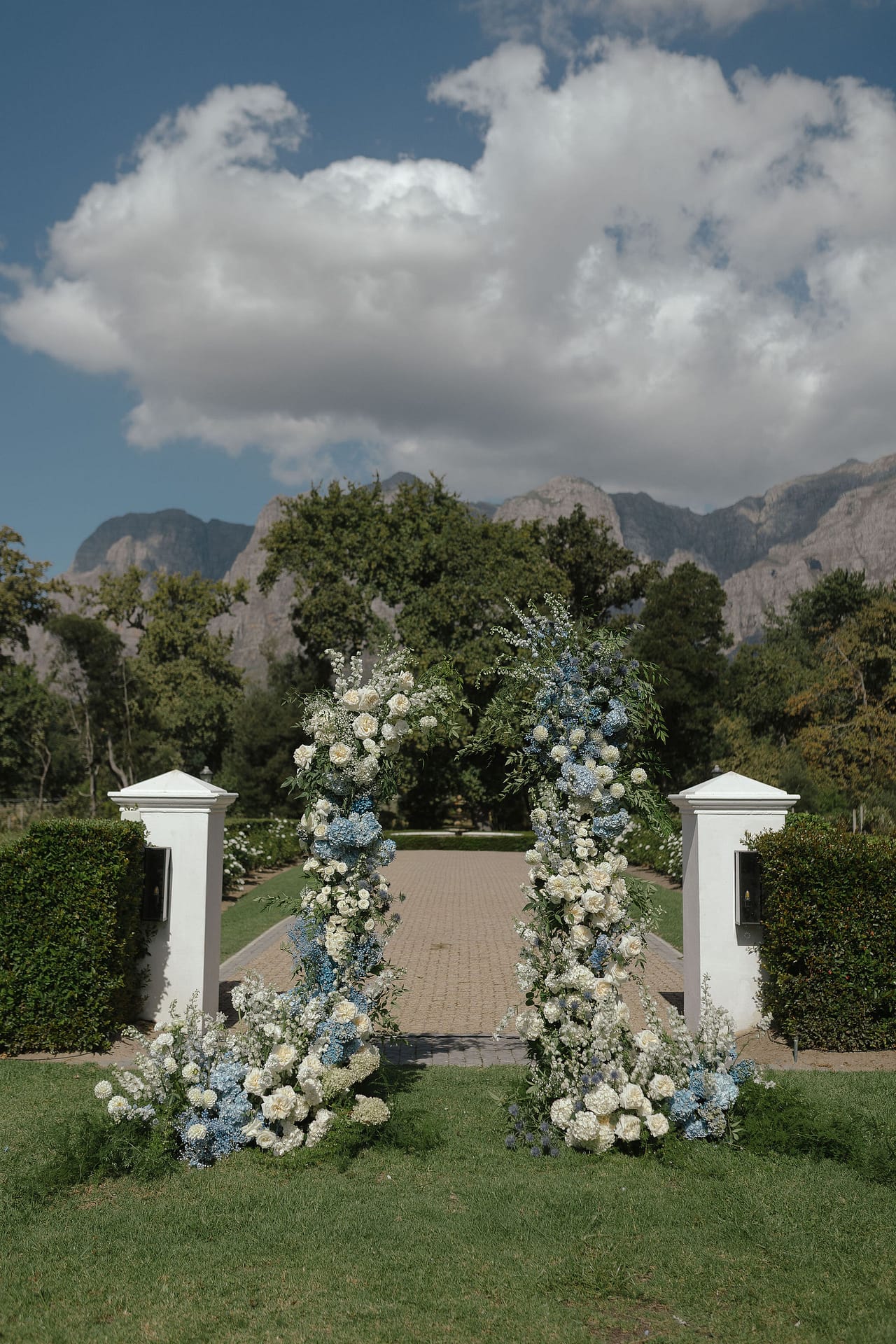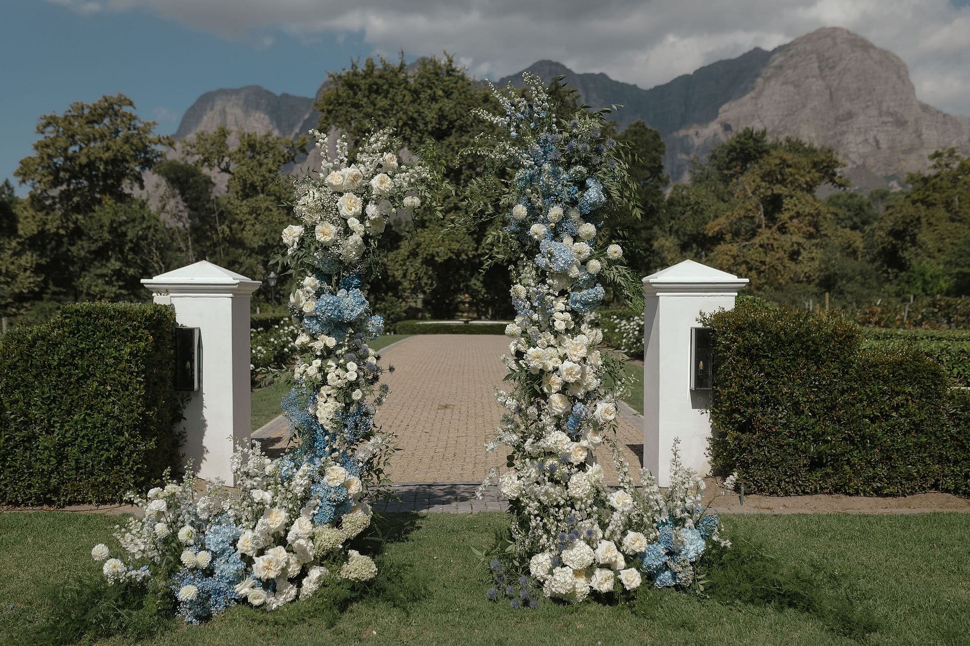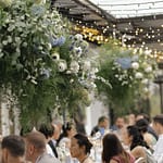 The wedding day itself carried a completely different tone, while still feeling true to them. The design centred around a blue and white palette, clean, classic, and striking without trying too hard. Curved tables softened the space and created a more fluid layout, encouraging conversation and movement throughout the evening.
