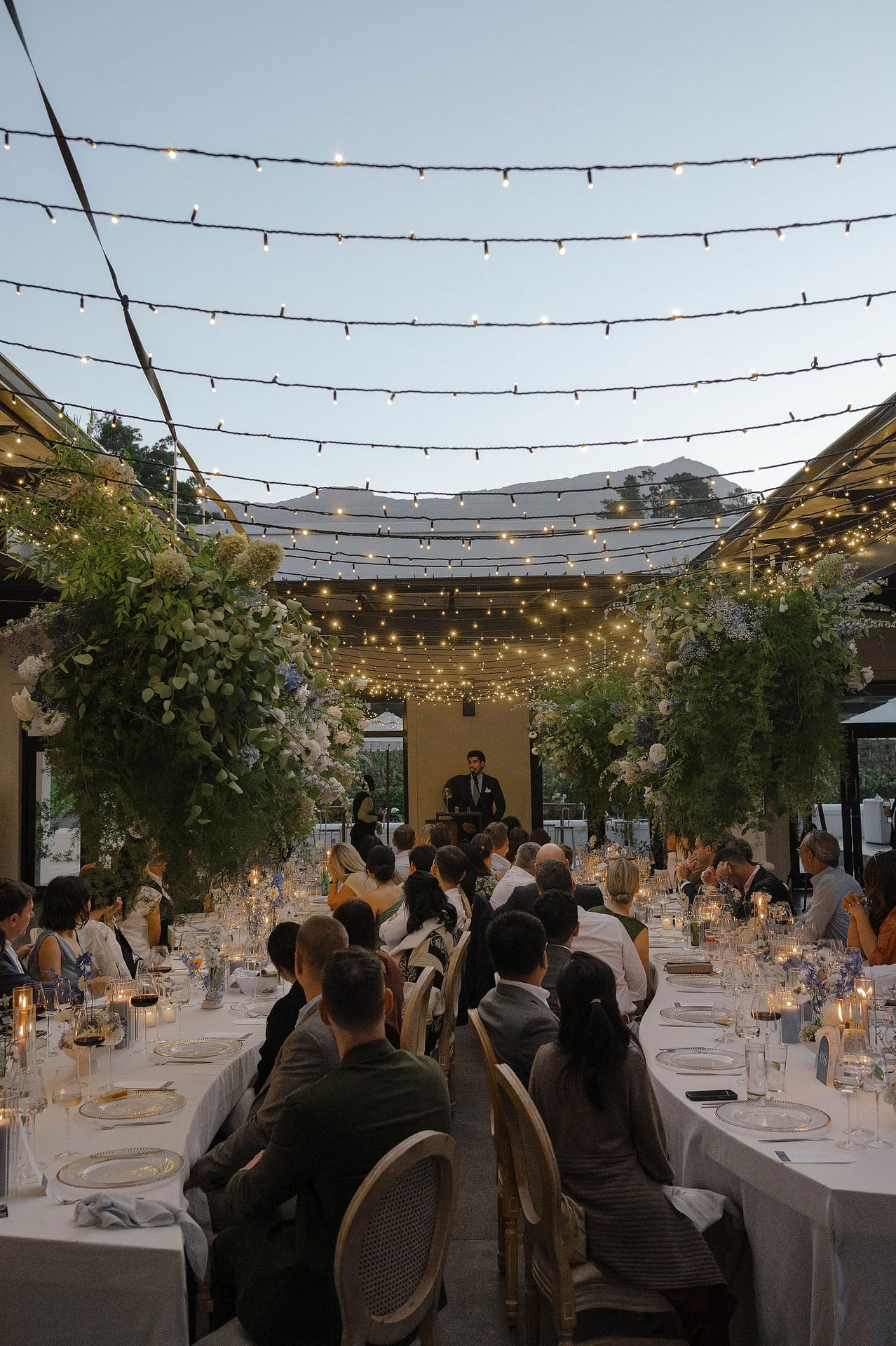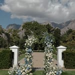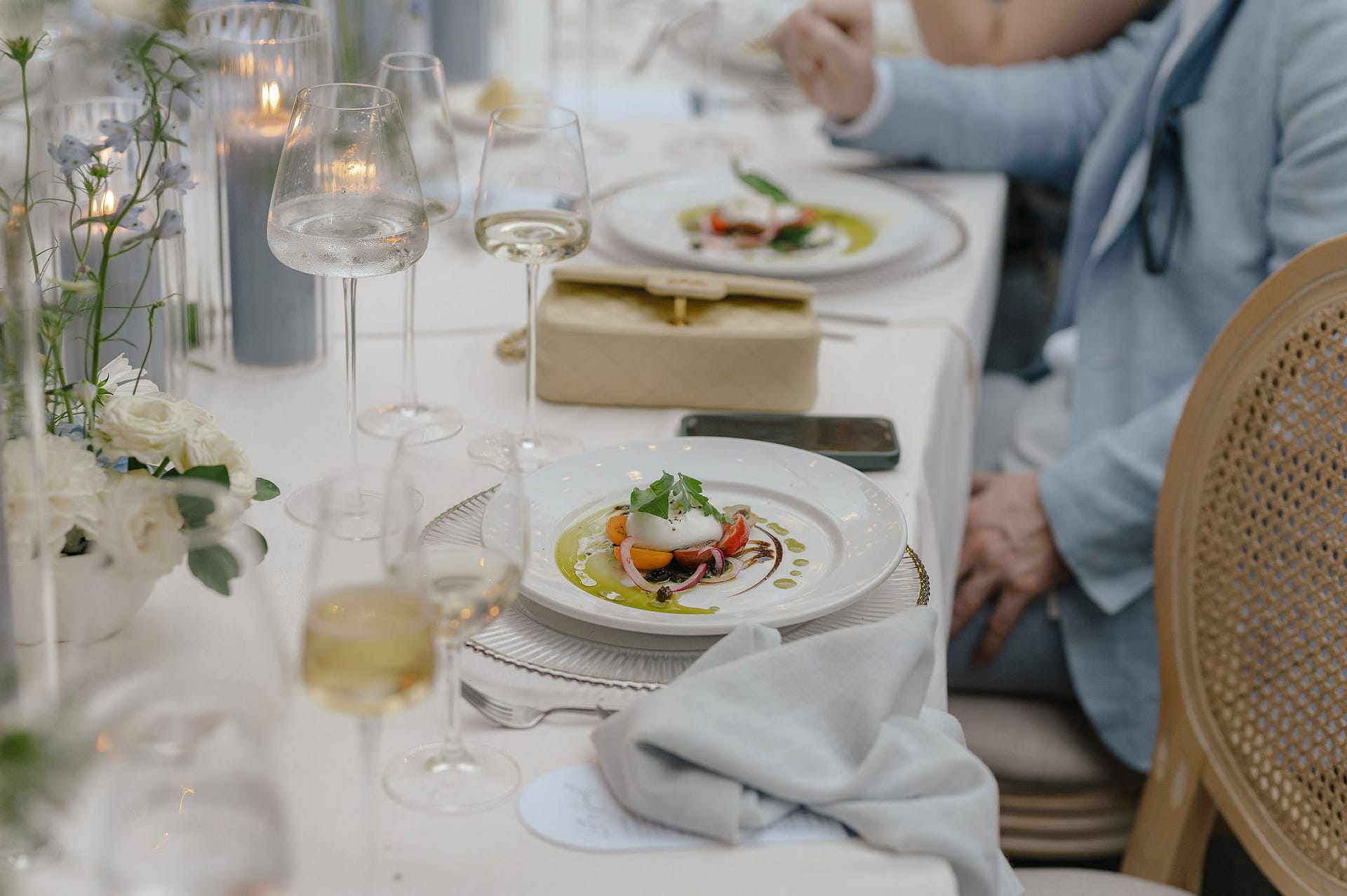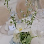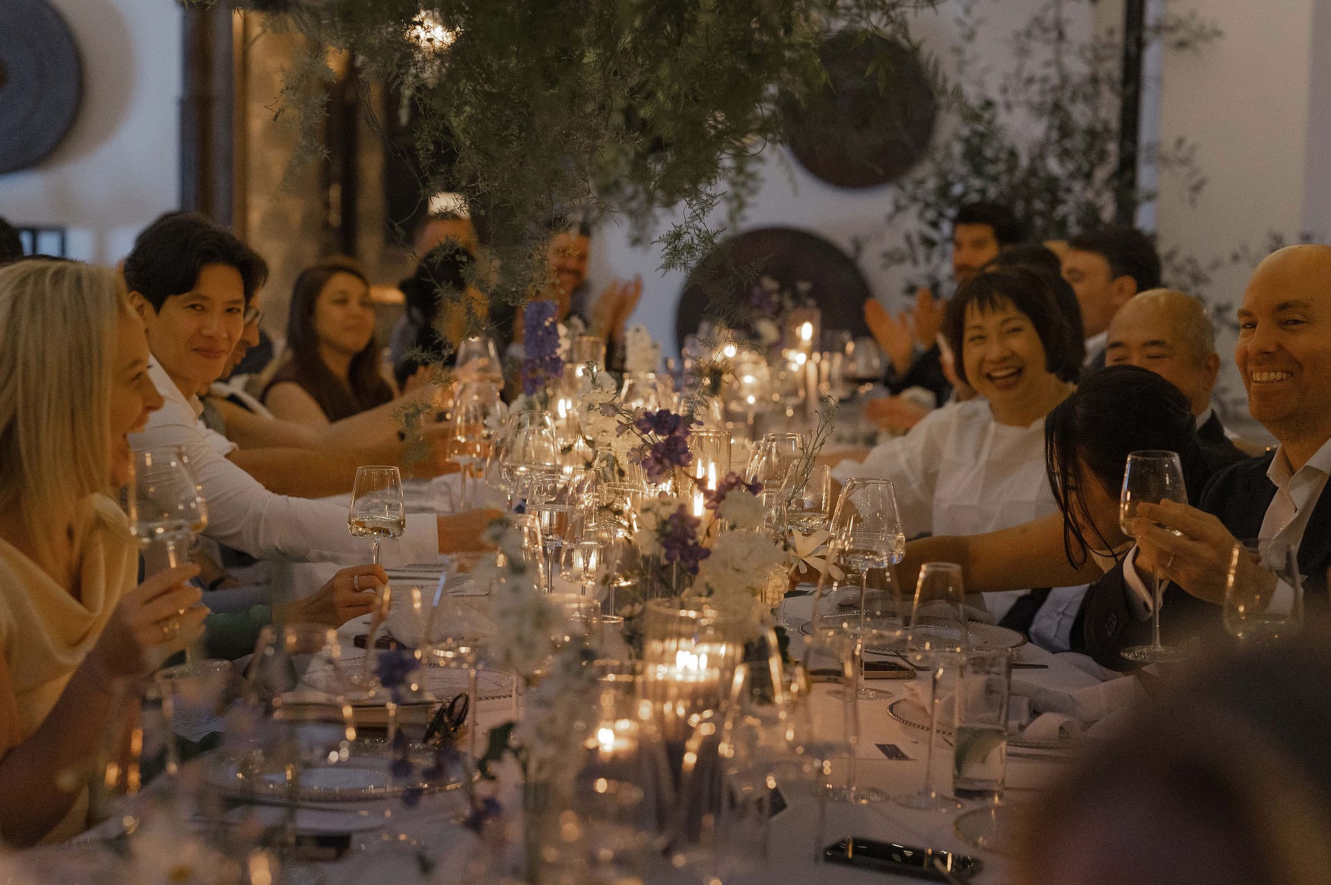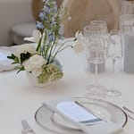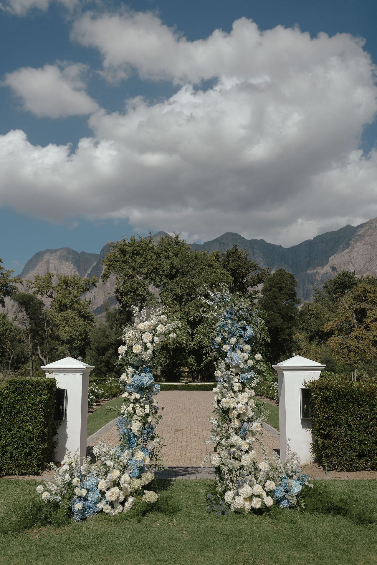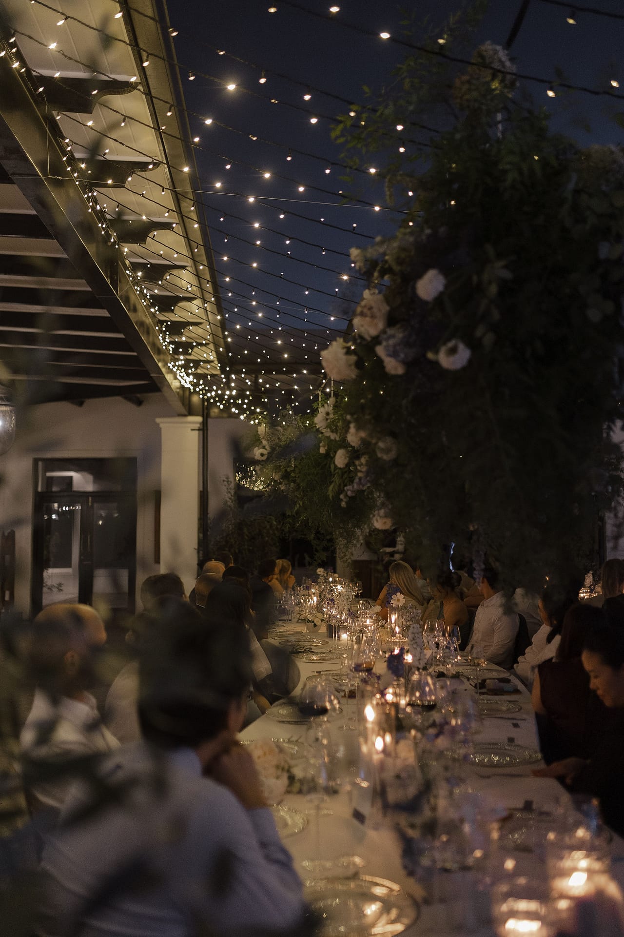 The wedding day itself carried a completely different tone, while still feeling true to them. The design centred around a blue and white palette, clean, classic, and striking without trying too hard. Curved tables softened the space and created a more fluid layout, encouraging conversation and movement throughout the evening.