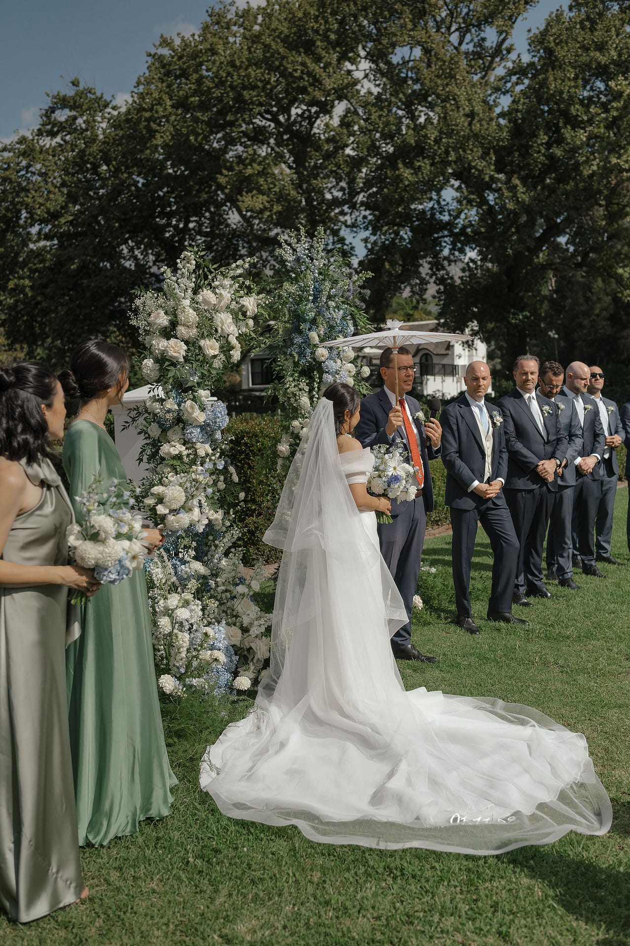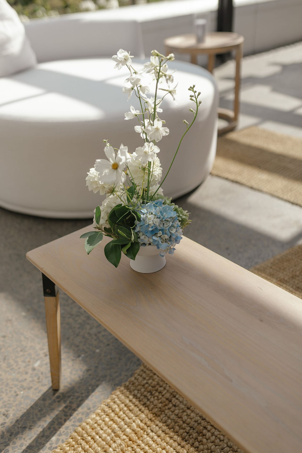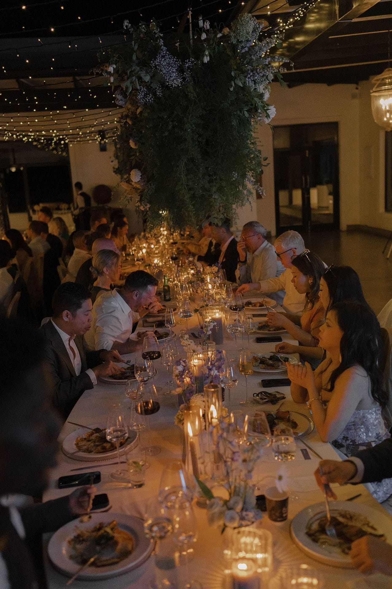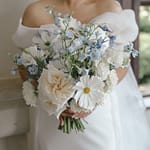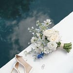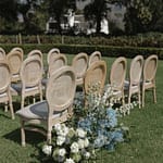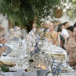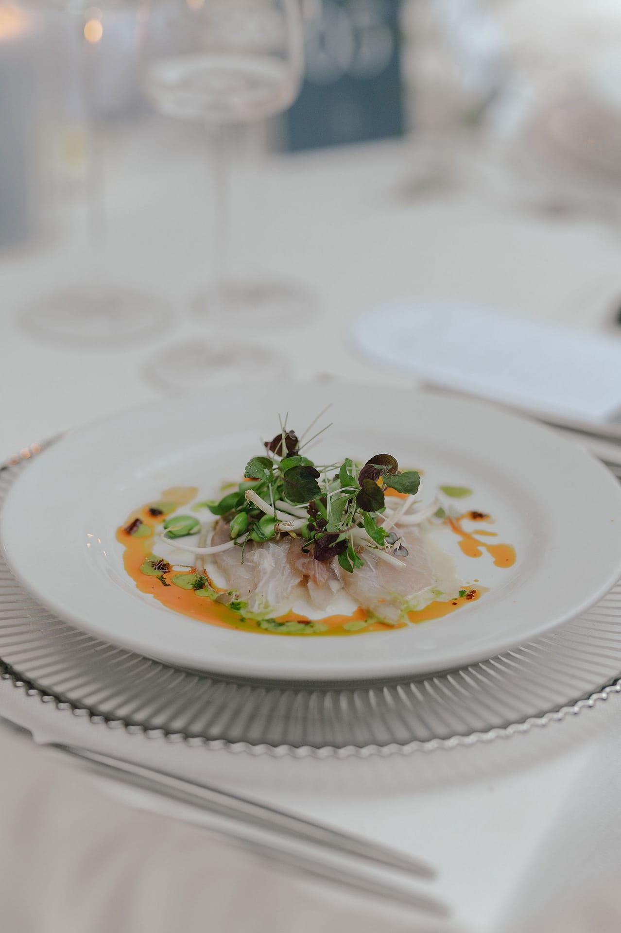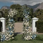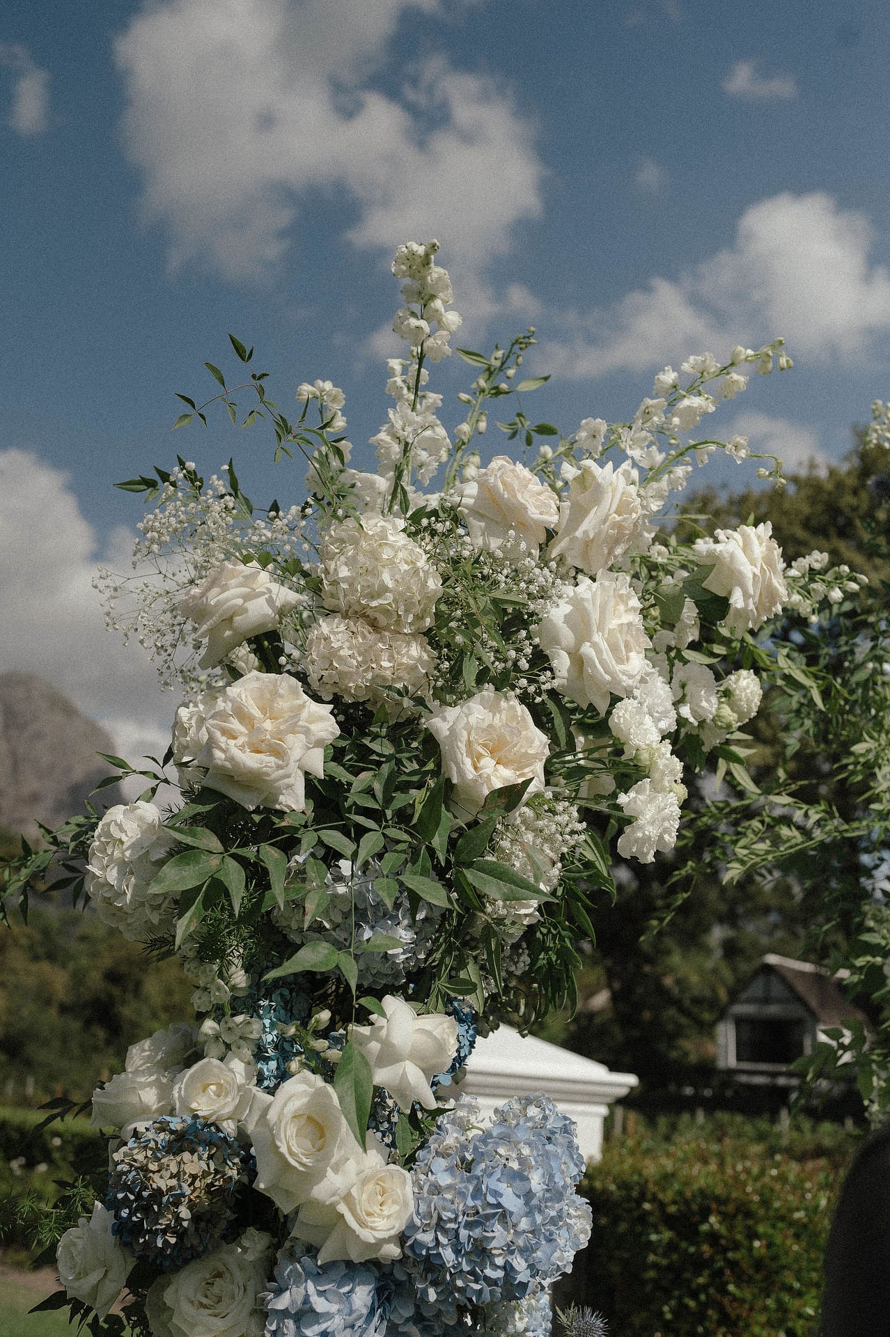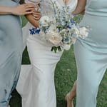 The wedding day itself carried a completely different tone, while still feeling true to them. The design centred around a blue and white palette, clean, classic, and striking without trying too hard. Curved tables softened the space and created a more fluid layout, encouraging conversation and movement throughout the evening.