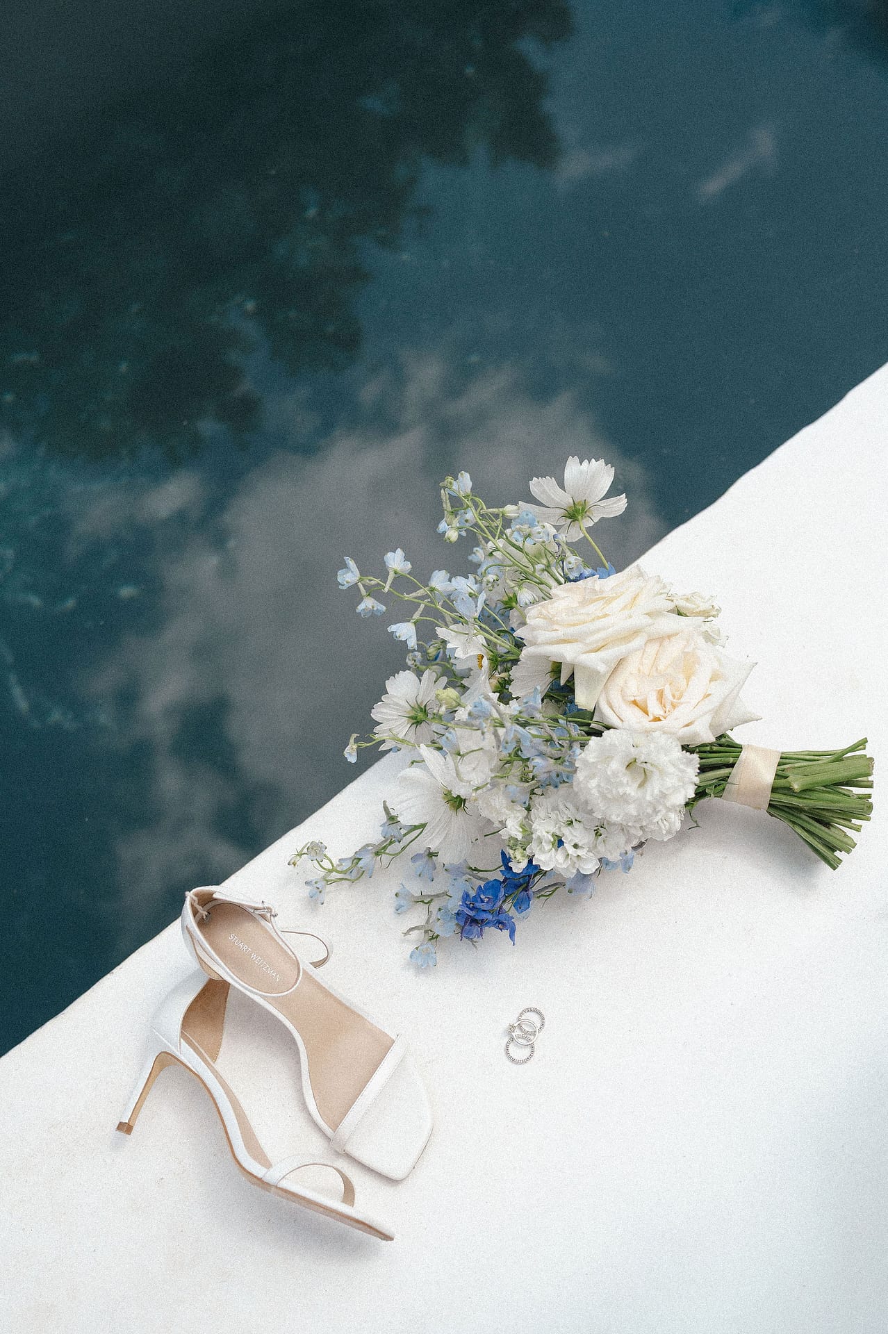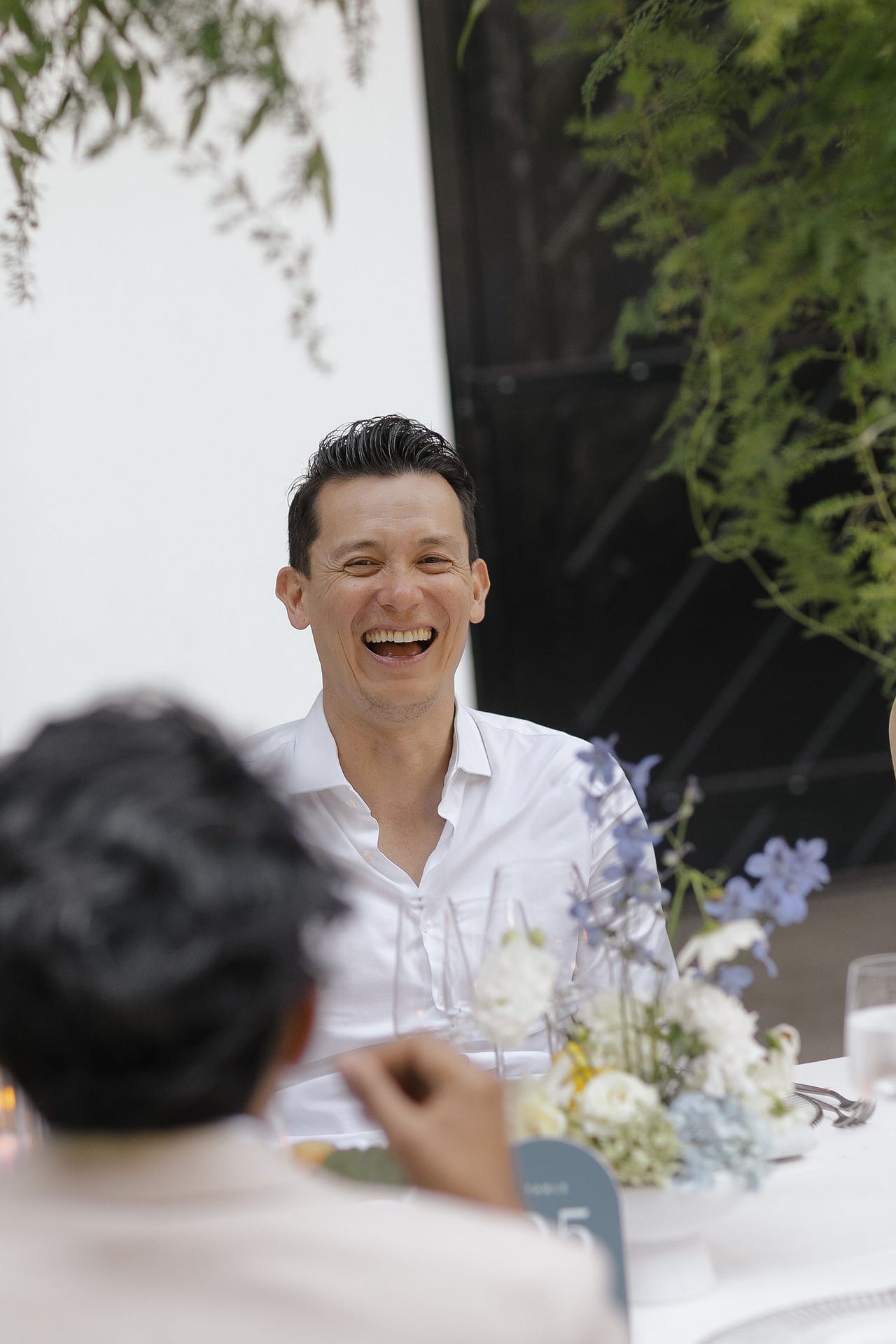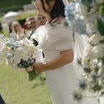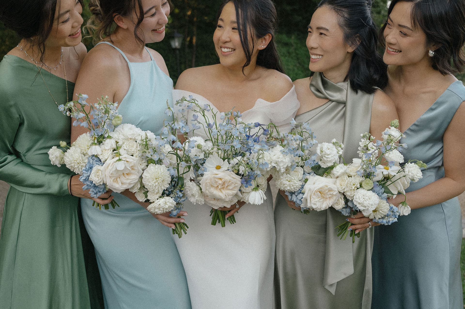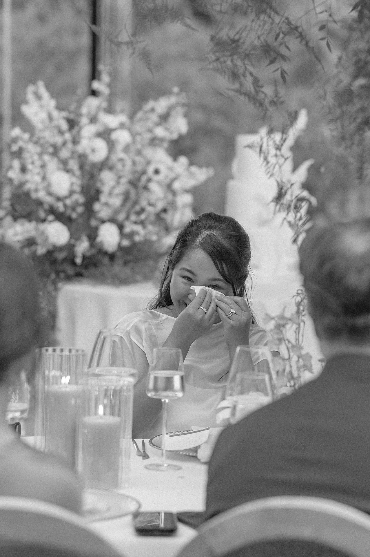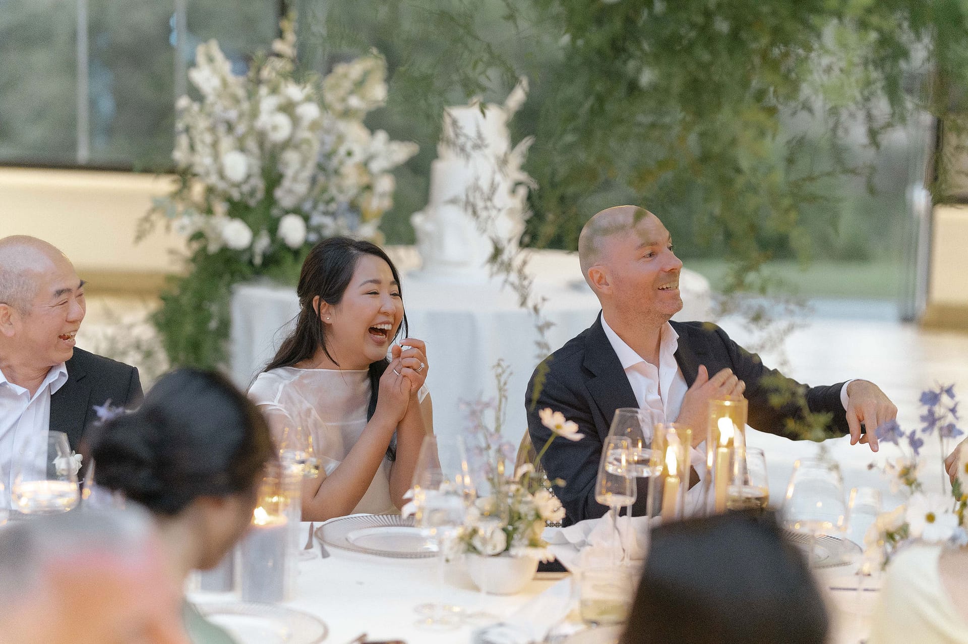 The wedding day itself carried a completely different tone, while still feeling true to them. The design centred around a blue and white palette, clean, classic, and striking without trying too hard. Curved tables softened the space and created a more fluid layout, encouraging conversation and movement throughout the evening.